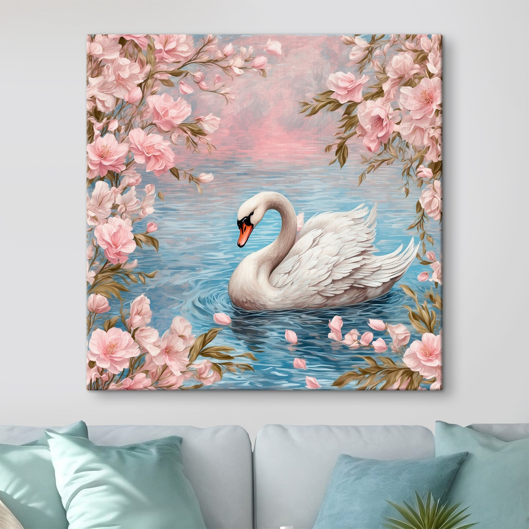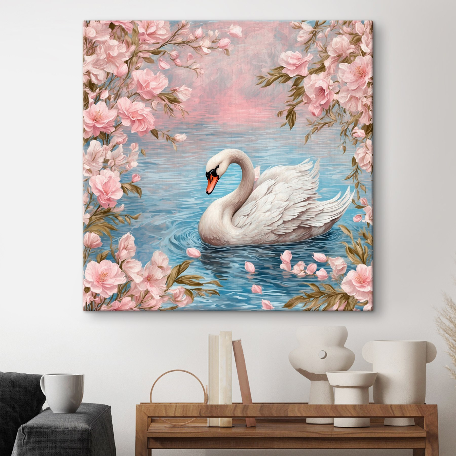 Scufundați-vă într-o evadare senină cu această minunată imprimare pe pânză a unei lebede alunecând prin ape liniștite, încadrată de flori roz suav. Imaginați-vă această frumusețe luminând un colțișor confortabil, unde invită la visare cu ochii deschiși și la momente liniștite. Este ca și cum ai avea o mini evadare chiar în camera ta de zi. Culorile blânde creează un vibe calmant, perfect pentru oricine are nevoie de o mică bucată de natură în interior. În plus, se potrivește bine cu toate tipurile de decor – clasic sau modern. Cine nu și-ar dori o lebădă în casa sa? Imaginați-vă doar sorbind ceai lângă această piesă uimitoare, simțindu-vă calm și inspirat. Perfectă atât pentru iubitorii de animale, cât și pentru pasionații de flori!
