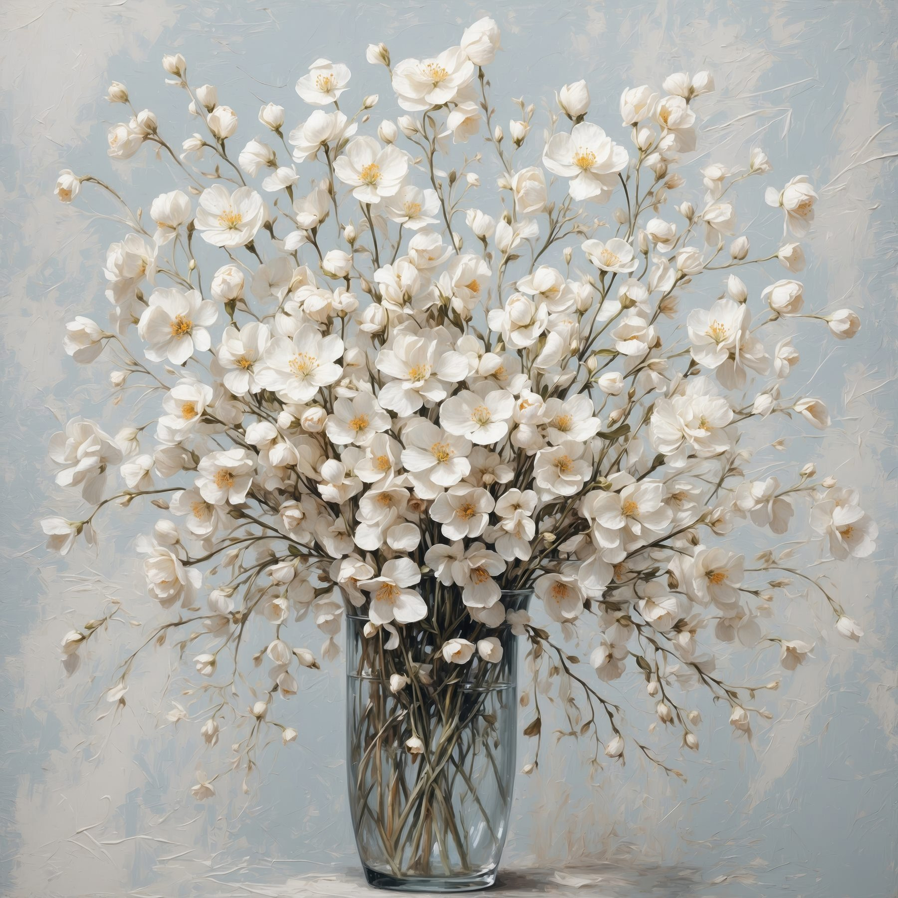 Înveseliți orice cameră cu această uimitoare imprimare pe pânză “Vase de flori albe”. Imaginați-vă că intrați în spațiul dvs. și vedeți această explozie de frumusețe blândă – ca o gură de aer proaspăt! Florile albe moi par să se legene și să danseze, aducând o notă de natură chiar în casa dvs. Este perfectă pentru acel colț confortabil sau deasupra unei canapele unde prietenii se adună să soarbă cafea și să discute. Puncte bonus: nu necesită udare! Adaugă căldură și farmec fără agitația florilor vii. În plus, cui nu-i place puțină eleganță pe pereți? Este ca și cum ai avea o zi de primăvară perpetuă în interior!