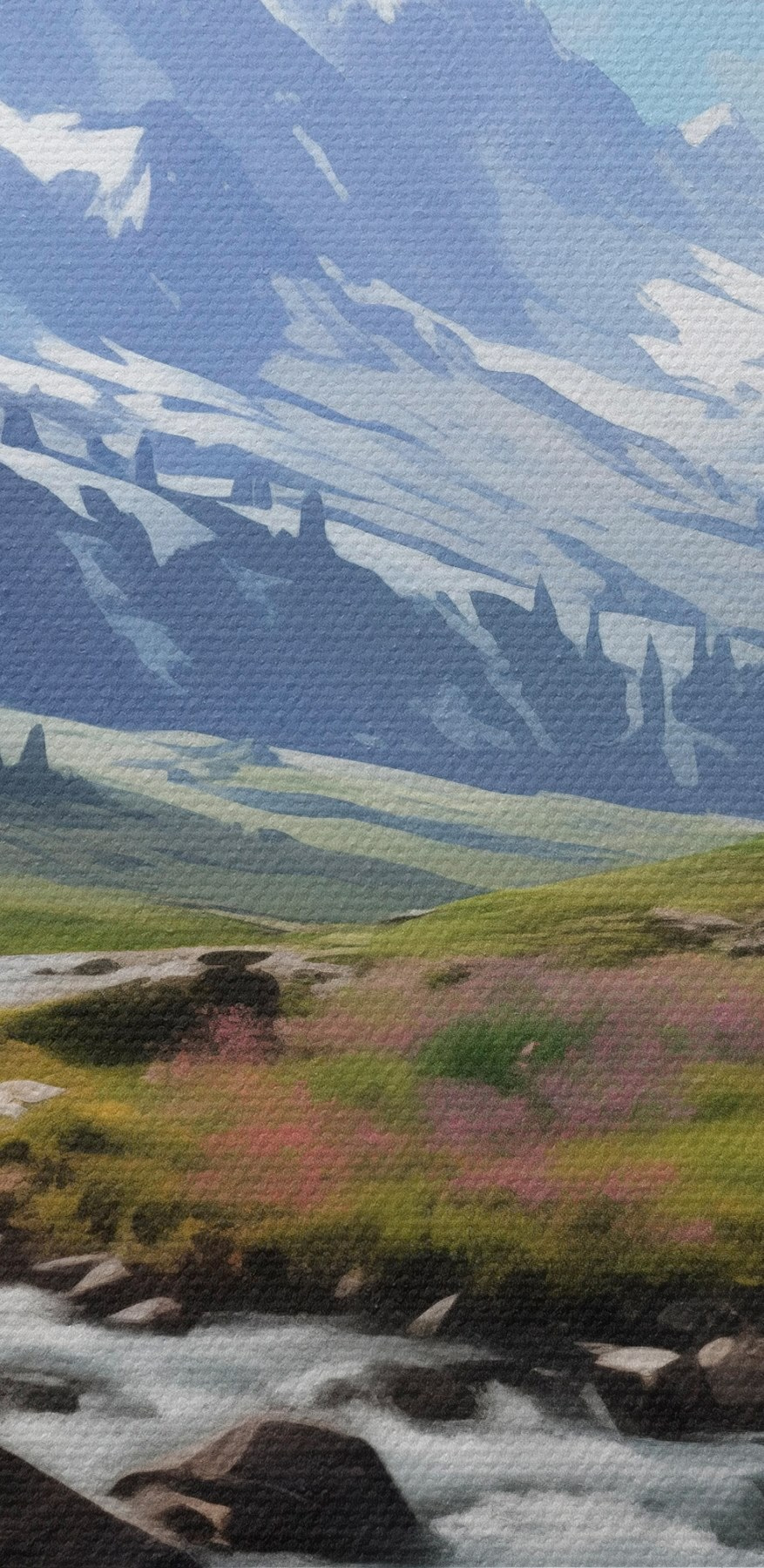 Imaginați-vă acest lucru: un râu strălucitor șerpuind printr-o vale luxuriantă, flancat de munți maiestuoși, acoperiți de zăpadă. Acest print pe pânză este ca o mini-vacanță chiar în sufrageria dvs. Imaginați-vă sorbind un ceai în timp ce priviți florile roz vibrante care împânzesc peisajul, culorile atât de vii încât aproape fredonează de bucurie. Este o evadare senină din agitația cotidiană, o amintire a faptului că frumusețea naturii este doar la o privire distanță. Această operă de artă șoptește calm, făcând ca orice spațiu să se simtă mai liniștit. Perfect pentru a visa cu ochii deschiși sau pentru a vă lăsa mintea să rătăcească. Este vorba despre a aduce un pic de natură în interior – cine nu și-ar dori asta?