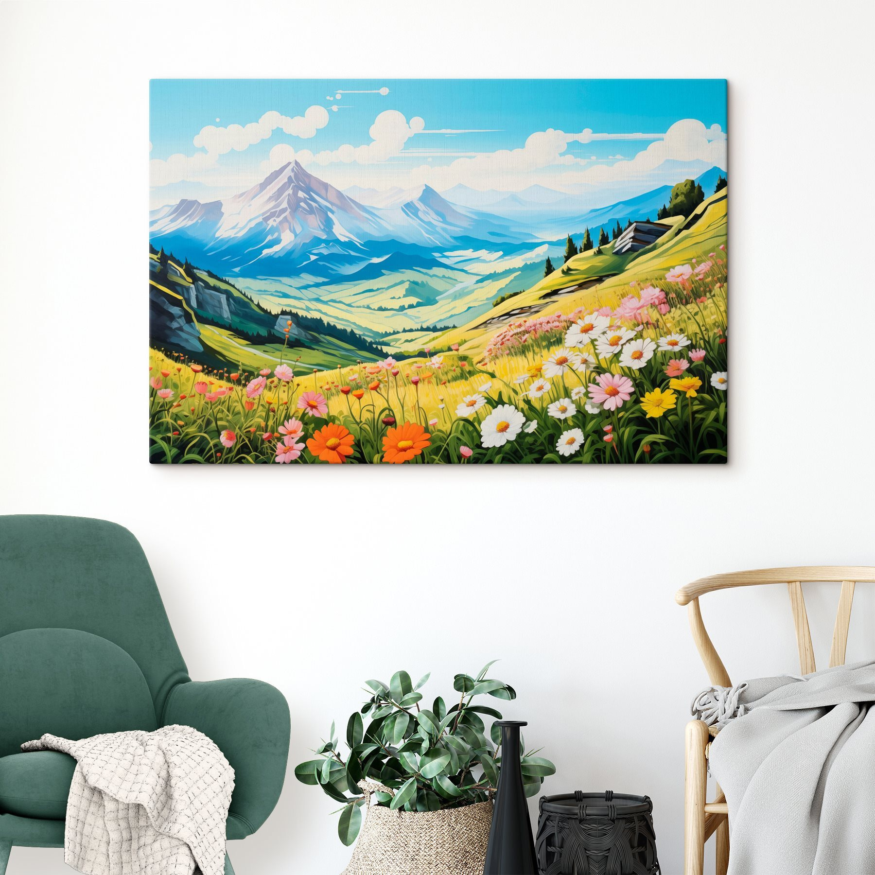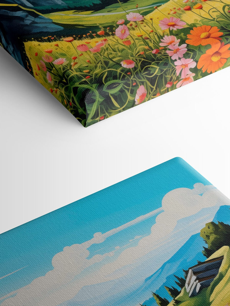 Transformați orice spațiu într-o evadare senină cu această imprimare uimitoare pe pânză. “Tablouri Landscape with Mountains and Flowers” surprinde o lume vibrantă în care vârfurile maiestuoase întâlnesc câmpurile înflorite. Imaginați-vă sorbindu-vă cafeaua de dimineață, înconjurați de aceste flori colorate și de munții care vă taie respirația – vorbiți despre un stimulent al dispoziției! Amestecul de nuanțe luminoase și pasteluri blânde creează un echilibru perfect, făcându-l să se simtă în același timp vesel și liniștitor. Agățați-o în camera de zi sau în dormitor și lăsați frumusețea naturii să vă inspire ziua. Cine nu și-ar dori o mică felie de paradis acasă?