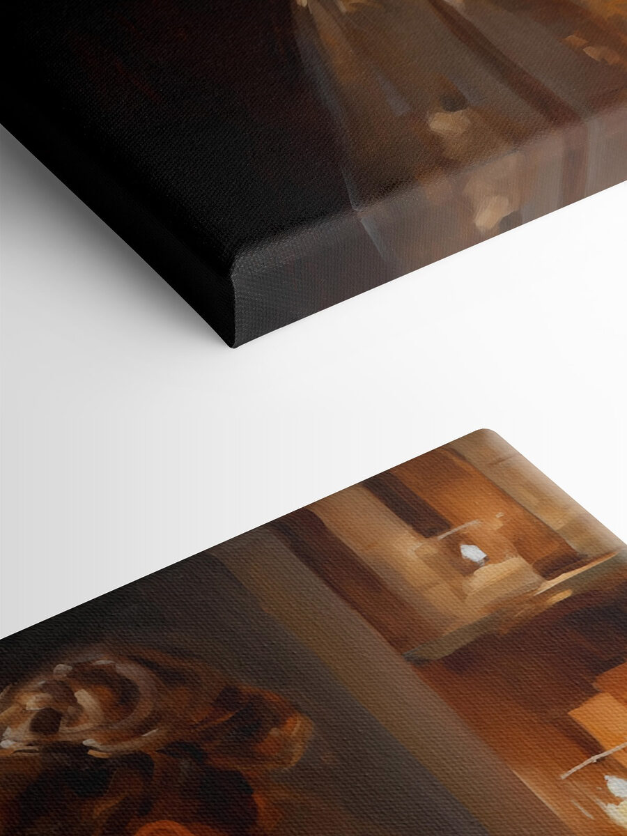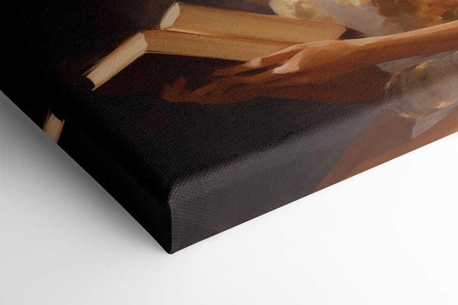 Imaginați-vă un colțișor confortabil în casa dvs., unde această imprimare încântătoare pe pânză a unei femei pierdute în cartea ei își găsește locul perfect. Este ca și cum ai surprinde un instantaneu al unui moment de liniște – unul în care timpul încetinește, iar lumea dispare puțin. Strălucirea blândă a lumânărilor și eleganța suavă a rochiei ei aduc o atmosferă caldă, de epocă, care emană confort. Este aproape ca și cum ea ar cunoaște toate secretele universului și te invită să i te alături în această mică aventură. O piesă care stârnește conversații sau, pur și simplu, o piesă care stârnește bucurie într-o după-amiază liniștită. Perfectă pentru iubitorii de cărți și visători deopotrivă!