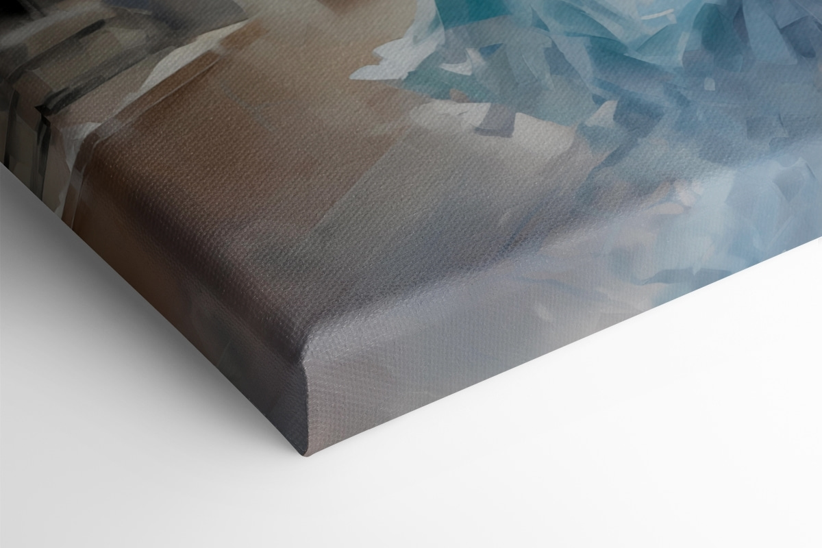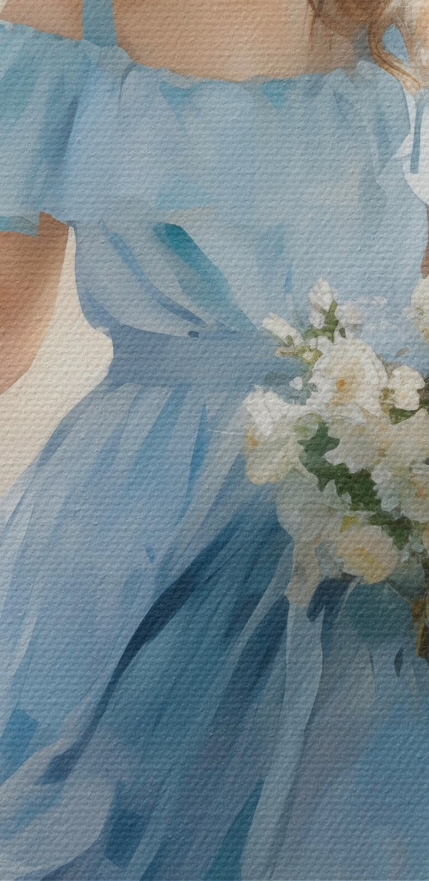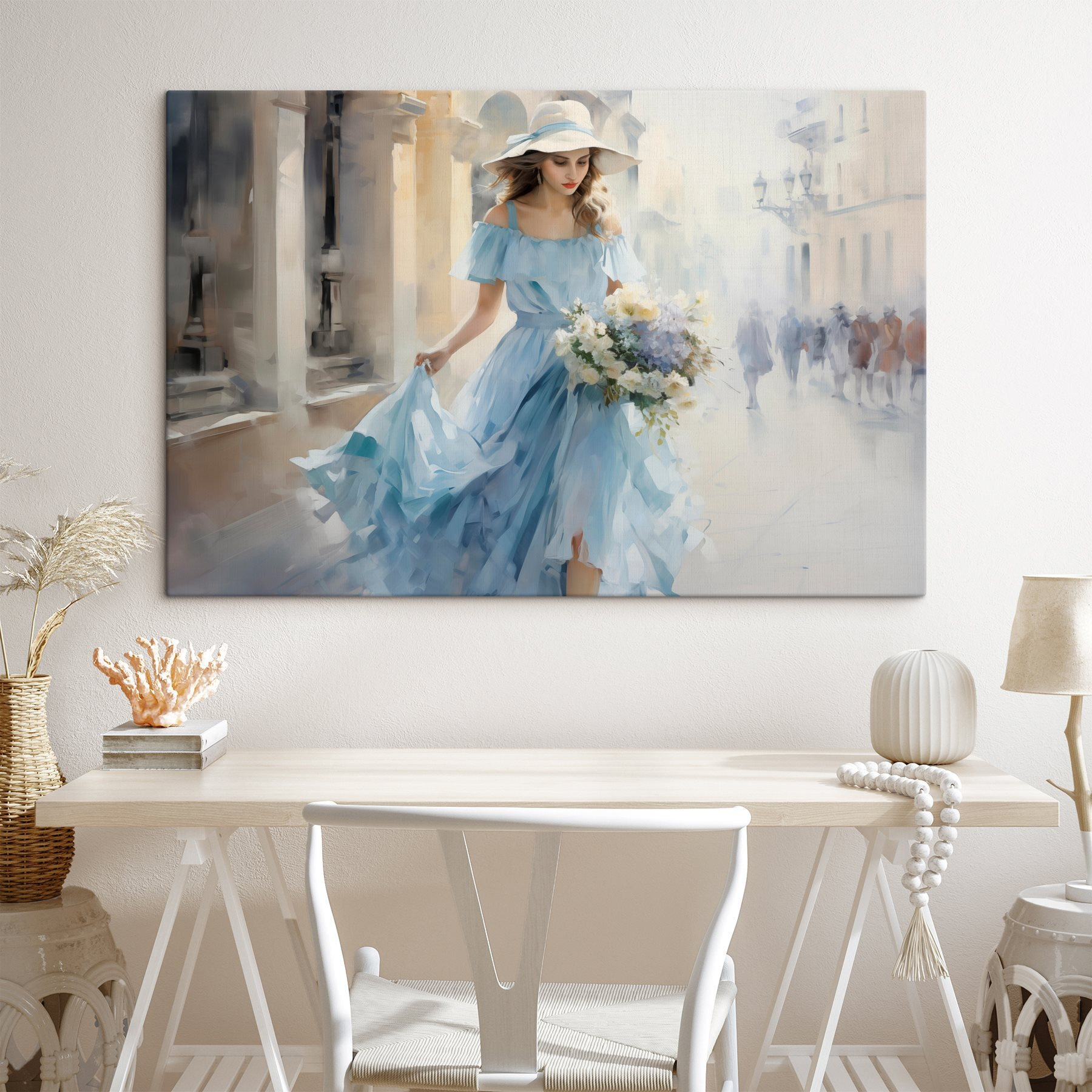 Imaginați-vă o după-amiază senină, în care o femeie încântătoare într-o rochie albastră fluturată se plimbă ușor pe o stradă luminată de soare, cu flori în mână – vorbiți despre un vis cu ochii deschiși! Acest print pe pânză surprinde perfect acel moment magic. Albastrul moale și florile delicate par să șoptească căldură și farmec în orice spațiu. Este ca și cum ai avea un strop de bucurie chiar pe perete.