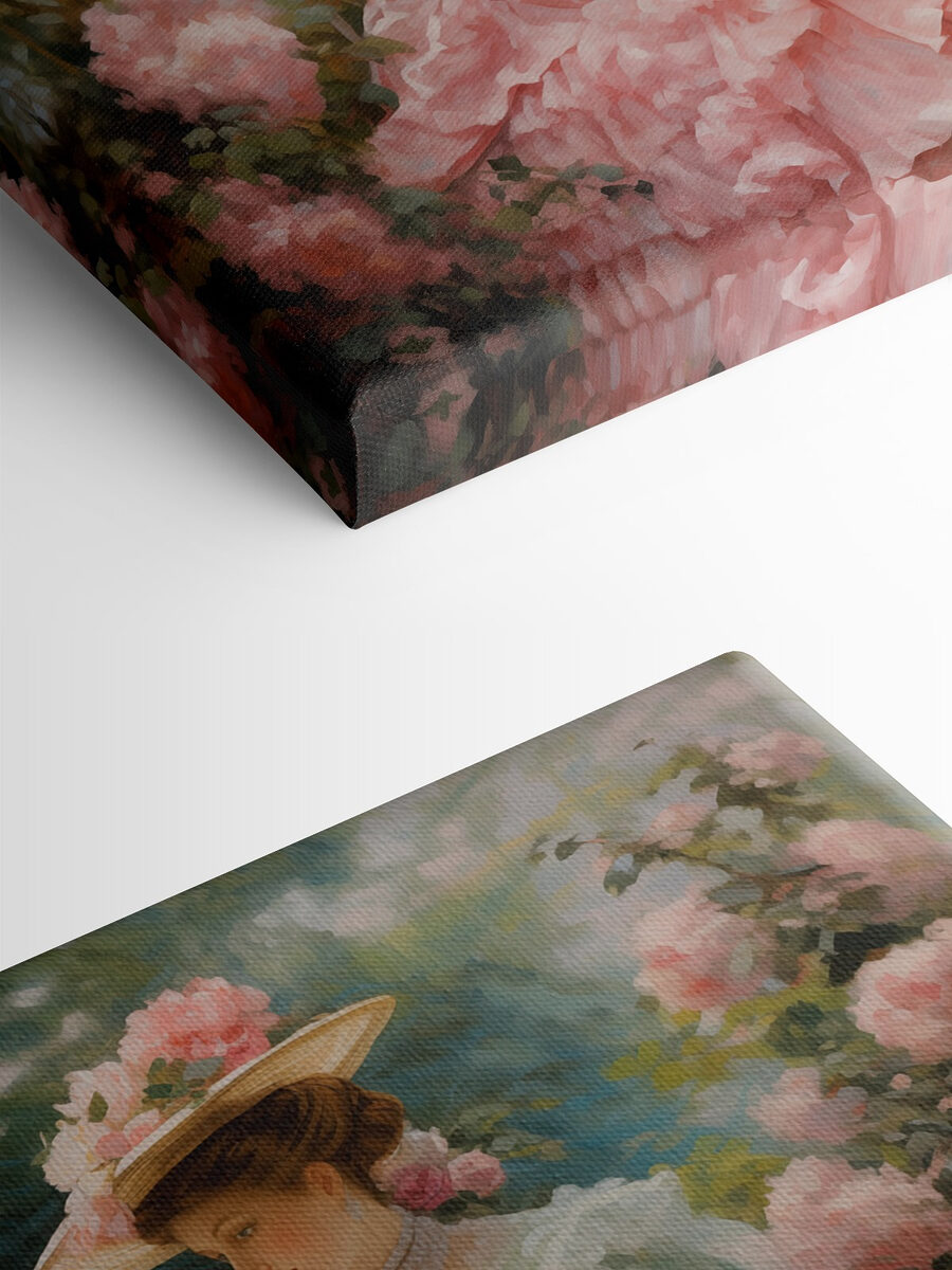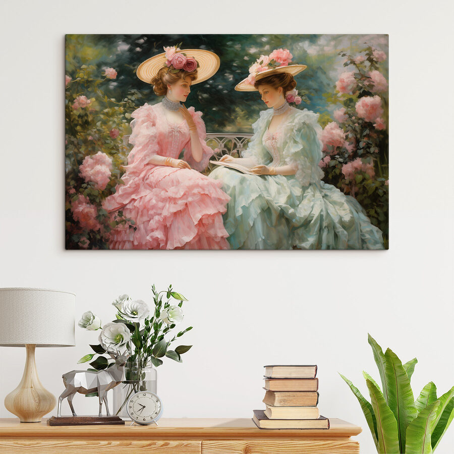 Pășiți într-o lume a eleganței cu această imprimare uimitoare pe pânză care prezintă două femei în rochii frumoase și pălării supradimensionate. Imaginați-vă foșnetul blând al rochiilor lor în timp ce stau în mijlocul trandafirilor înfloriți, cufundate într-un moment de grație atemporală. Această operă de artă aduce un strop de farmec vintage și o gură de aer proaspăt în orice spațiu. Este ca și cum ai invita o grădină de primăvară chiar în casa ta! Perfectă pentru a înveseli o cameră de zi sau pentru a adăuga ceva farmec unui colț de lectură confortabil, această imprimare șoptește povești despre după-amiezi liniștite și picnicuri însorite. Pregătește-te pentru complimente care curg ca ceaiul dulce la o întâlnire de vară!