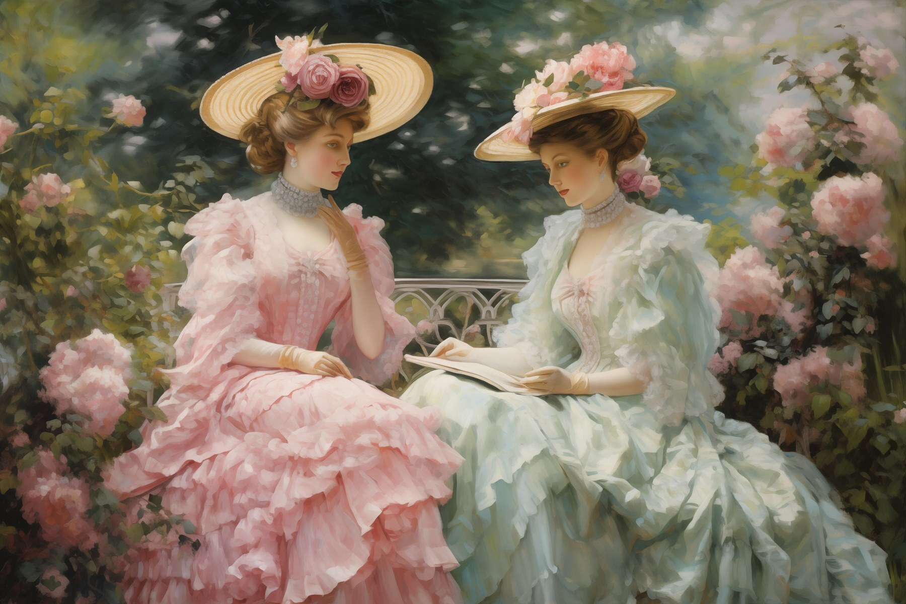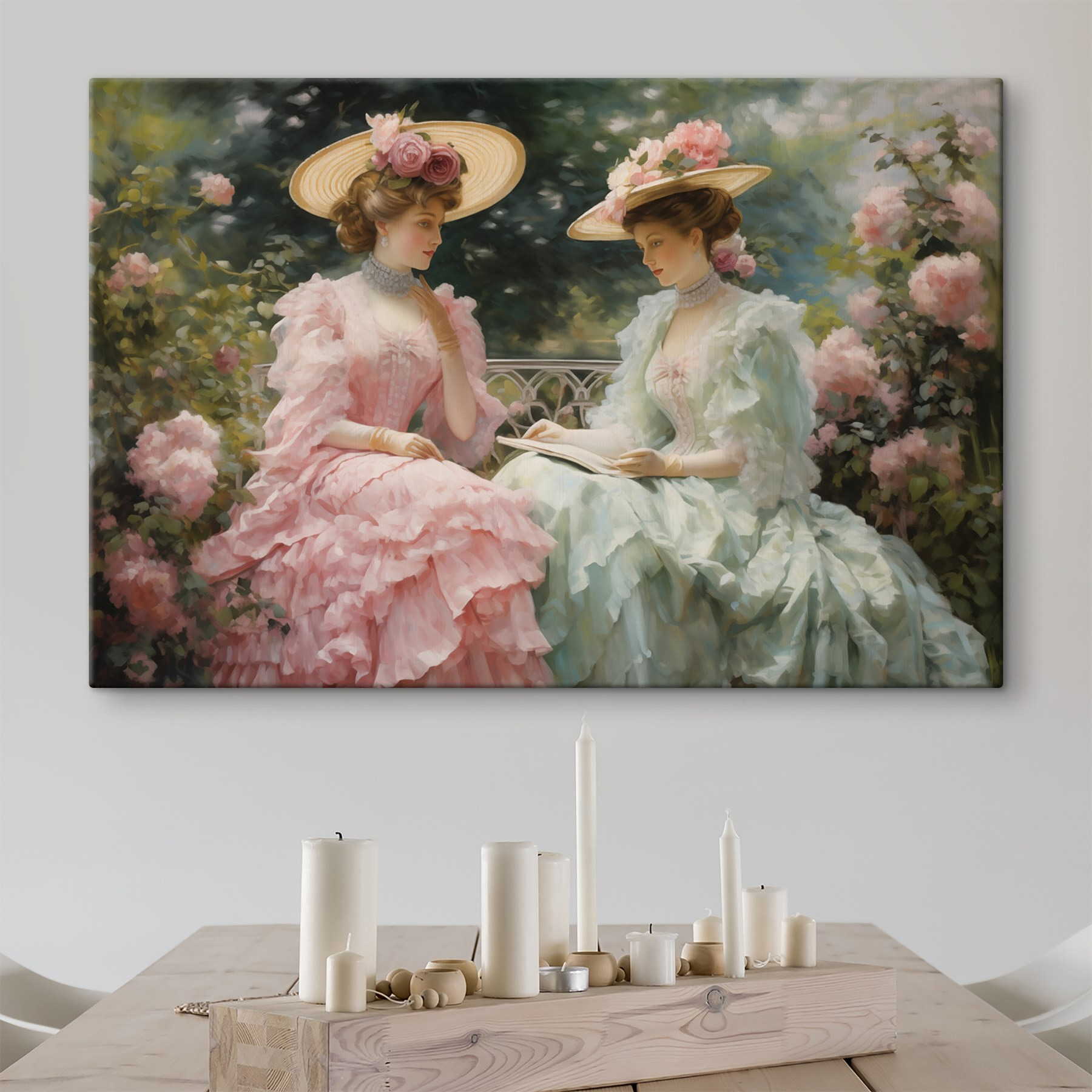 Pășiți într-o lume a eleganței cu această imprimare uimitoare pe pânză care prezintă două femei în rochii frumoase și pălării supradimensionate. Imaginați-vă foșnetul blând al rochiilor lor în timp ce stau în mijlocul trandafirilor înfloriți, cufundate într-un moment de grație atemporală. Această operă de artă aduce un strop de farmec vintage și o gură de aer proaspăt în orice spațiu. Este ca și cum ai invita o grădină de primăvară chiar în casa ta! Perfectă pentru a înveseli o cameră de zi sau pentru a adăuga ceva farmec unui colț de lectură confortabil, această imprimare șoptește povești despre după-amiezi liniștite și picnicuri însorite. Pregătește-te pentru complimente care curg ca ceaiul dulce la o întâlnire de vară!