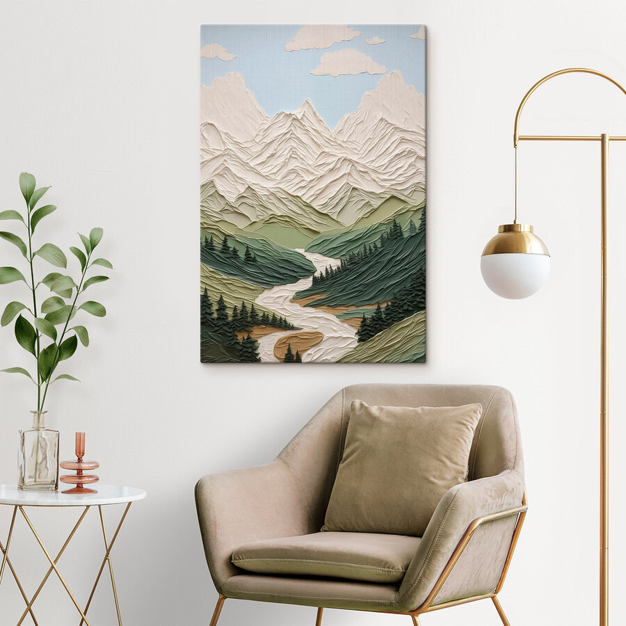 Intrați într-o bucată confortabilă de natură cu Tablouri Paper Cutout of a Mountain. Este ca și cum ai aduce marea natură chiar în sufrageria ta, fără insecte și probleme legate de vreme. Imaginați-vă că vă relaxați pe canapea, sorbind o băutură caldă și pierzându-vă în acești munți stratificați și râul care curge ușor.
