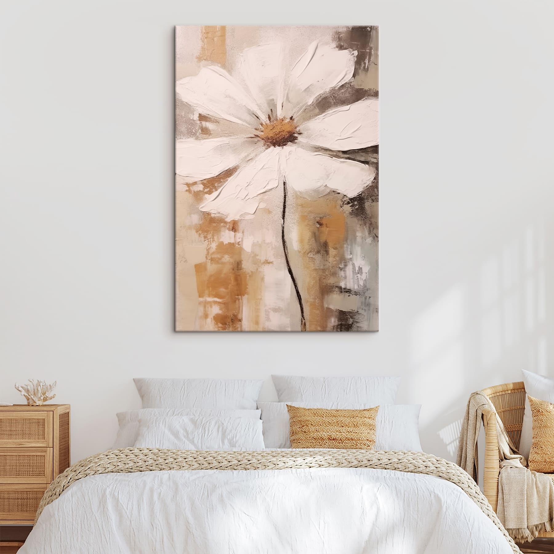 Imaginați-vă că intrați într-un spațiu confortabil și acolo este o imprimare uimitoare pe pânză a unei flori albe, care așteaptă doar să vă însenineze ziua. Este ca o gură de aer proaspăt, care ridică fără efort energia camerei. Floarea este înaltă și elegantă, așezată pe un fundal moale, cald, care șoptește relaxare. Perfectă pentru acel perete gol care implora puțină dragoste, sau deasupra unui colț de lectură unde poveștile înfloresc. Este genul de piesă care invită la visare cu ochii deschiși, făcându-te să te simți ca și cum ai avea natura chiar la tine acasă. Cine nu și-ar dori un pic de farmec floral pentru a inspira acele vibrații însorite?
