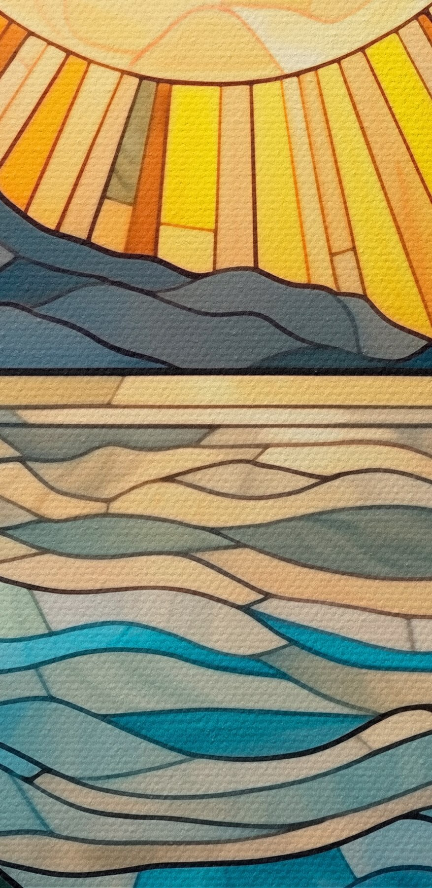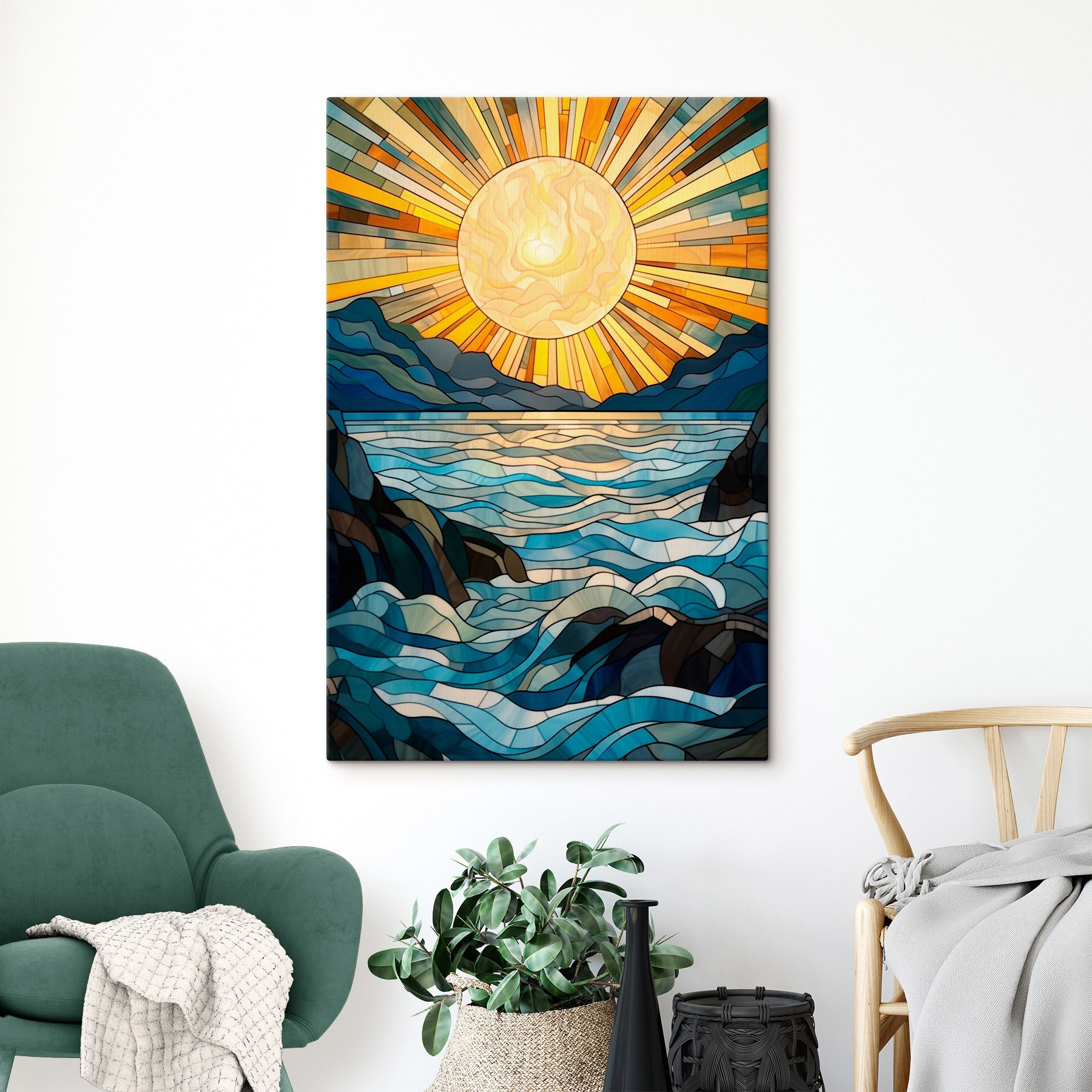 Aduceți o notă de natură în interior cu această imprimare uimitoare pe pânză, cu un design de vitraliu care surprinde un apus de soare radiant peste un râu liniștit. Imaginați-vă soarele revărsând nuanțe vibrante pe pereții dvs., transformând orice spațiu într-un refugiu liniștit. Este ca o invitație la pauză, la respirație și la aprecierea frumuseții simple a naturii. Fie că vă împodobește camera de zi sau luminează un colțișor confortabil, această operă de artă adaugă un strop de culoare și o notă de seninătate. Perfectă pentru după-amiezele leneșe petrecute visând cu ochii deschiși sau pur și simplu savurând o ceașcă de ceai – este o bucățică de paradis chiar la tine acasă.