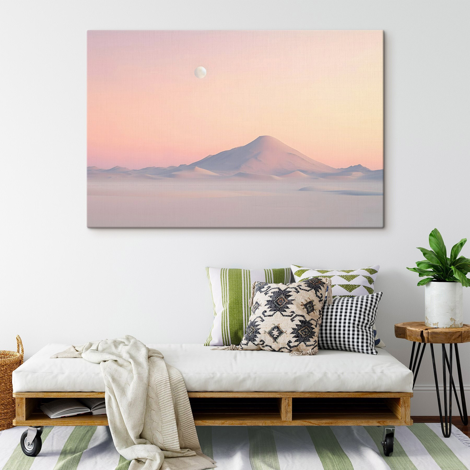 Transformați-vă spațiul cu imprimeul canvas de vis “Snow Covered Mountain in a Desert”. Imaginați-vă că vă sorbiți cafeaua de dimineață în timp ce priviți acest peisaj senin – vorbește despre un stimulent al dispoziției! Pastelurile blânde creează o vibrație liniștitoare care face ca orice cameră să se simtă instantaneu mai relaxată, ca și cum tocmai ați pășit într-un refugiu liniștit în deșert.