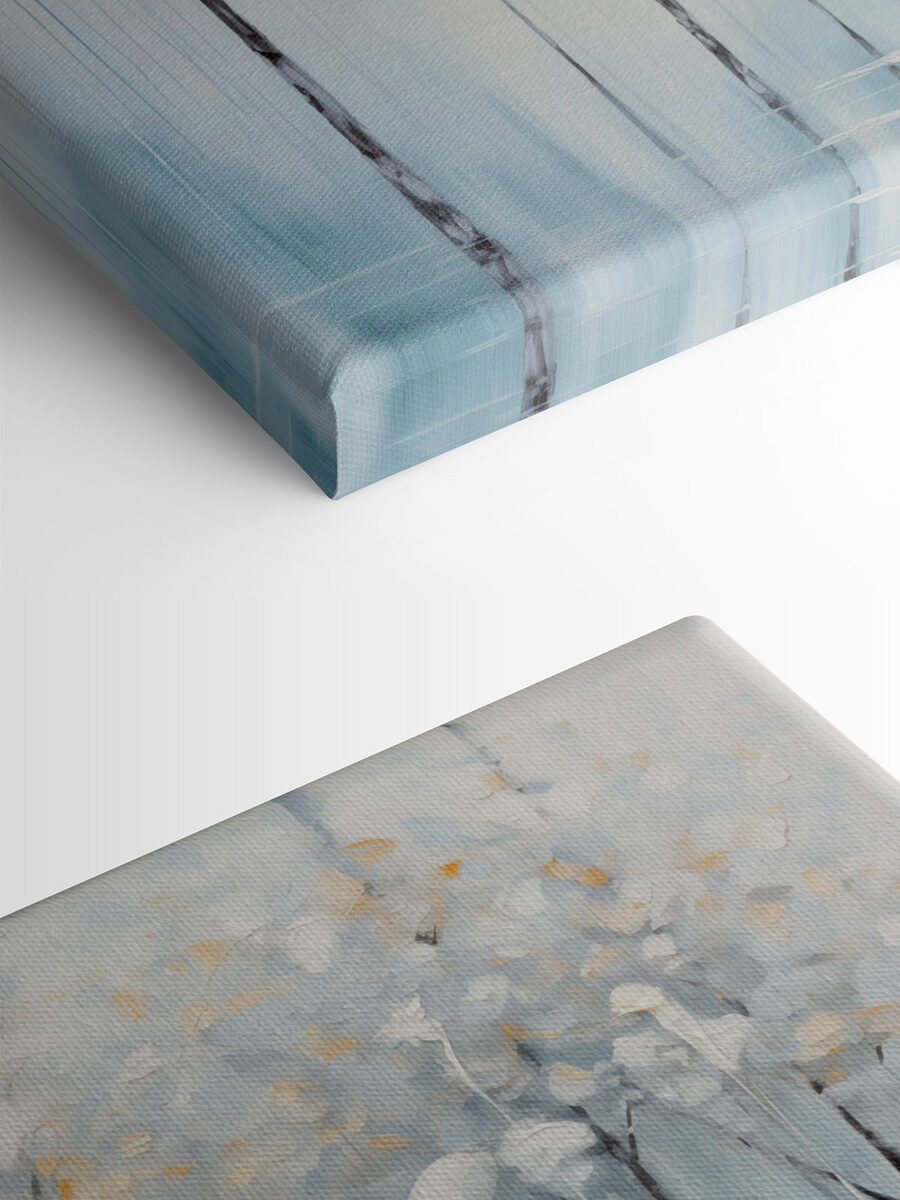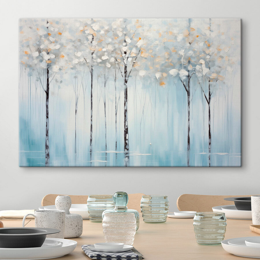 Transformați-vă spațiul cu această imprimare pe pânză fermecătoare, “Pictură pe pânză cu copaci într-un lac”. Imaginați-vă că pășiți într-o pădure senină în care copacii par să vă șoptească secrete. Albastrul moale și albul blând creează un vibe calmant, perfect pentru relaxare după o zi plină. Se simte ca o gură de aer proaspăt, aducând o fărâmă de natură în interior, fără riscul de a intra în noroi. Imaginați-vă sorbindu-vă cafeaua de dimineață în timp ce priviți această frumusețe – vorbiți despre un început confortabil! Această operă de artă nu este doar decor; este o bucățică de liniște, făcând ca orice cameră să se simtă ca un refugiu pașnic. Agățați-o și lăsați natura să își facă magia!