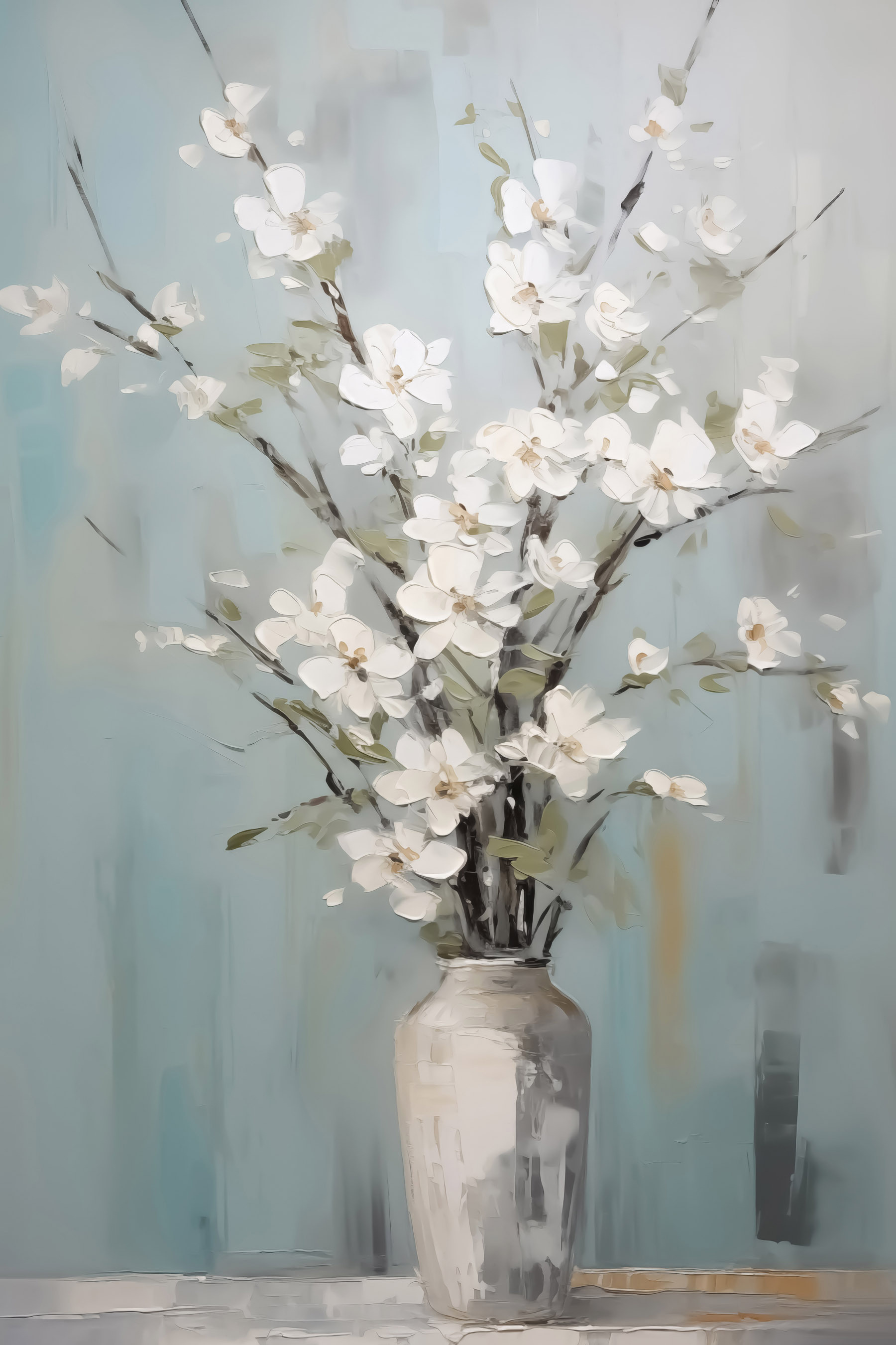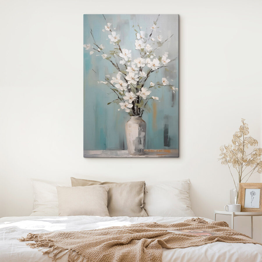 Înveseliți orice spațiu cu acest minunat print pe pânză care prezintă o vază fermecătoare plină cu flori albe delicate. Este ca o gură de aer proaspăt în formă de operă de artă. Fundalul albastru liniștitor face ca florile să iasă în evidență, oferind o atmosferă calmă care invită pe oricine din cameră să se oprească și să respire adânc. Imaginați-vă că intrați în sufragerie și simțiți că ați pășit într-o grădină senină – fără polenul deranjant! Acest print nu este doar un decor; este un memento blând pentru a îmbrățișa frumusețea în viața de zi cu zi. Perfectă pentru acele colțuri confortabile sau ca o piesă care stârnește conversații. Transformați-vă pereții într-o pânză a bucuriei!