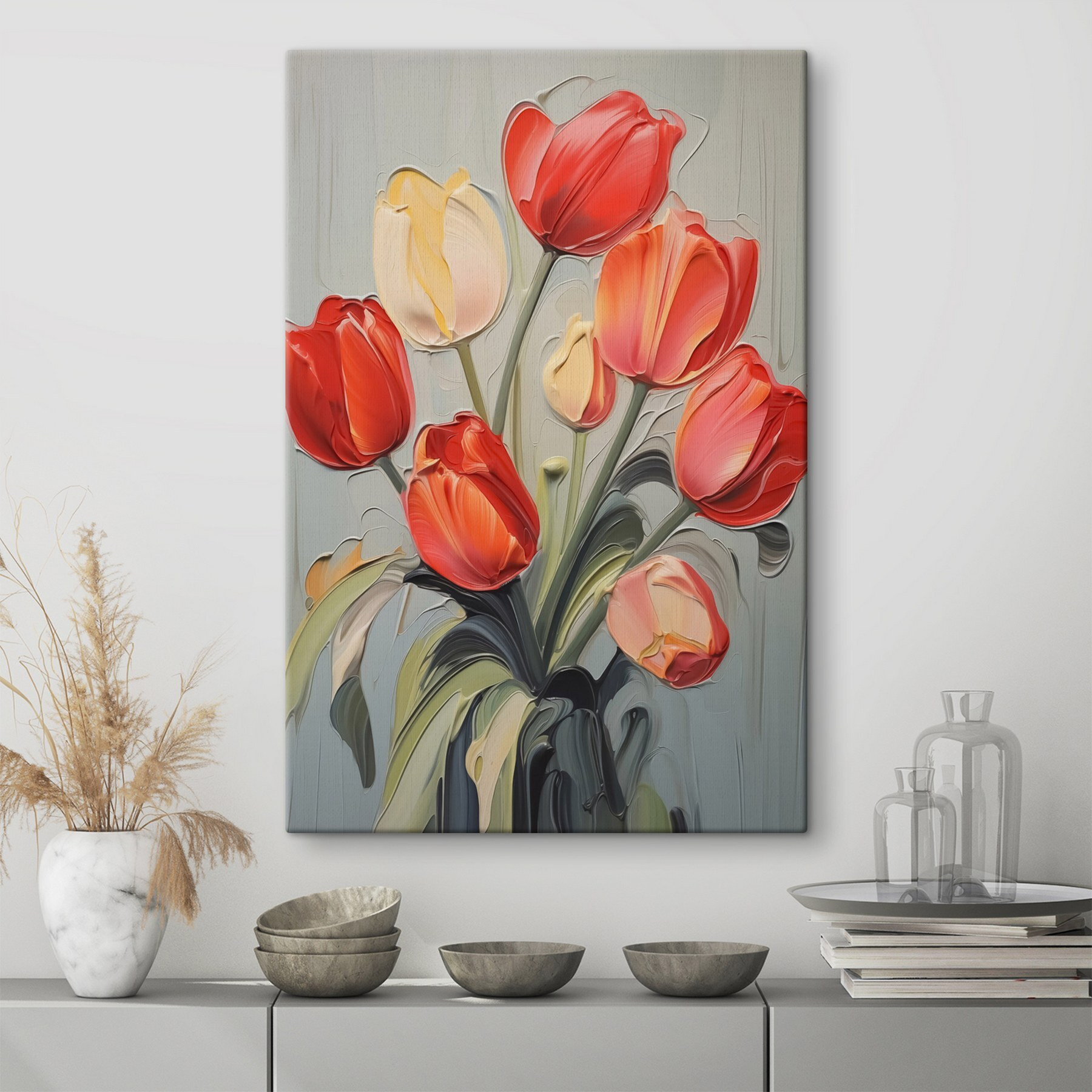Înveseliți un colț plictisitor cu această imprimare uimitoare pe pânză a lalelelor vibrante pe un fundal gri calm. Aceste flori minunate aduc un strop de culoare care dă senzația că primăvara este mereu în aer – serios, cine are nevoie de o grădină când poți avea artă? Imaginați-vă că intrați într-o cameră, vedeți acele petale jucăușe și simțiți instantaneu că vi se ridică starea de spirit. Este ca și cum ai avea o grădină secretă care nu se ofilește niciodată. Perfectă pentru camera de zi sau chiar pentru peretele gol de pe hol, care imploră puțină dragoste. Înflorește acolo unde ești plantat, nu?