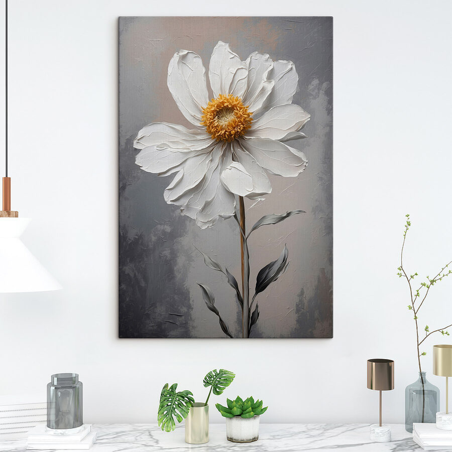 Înveseliți orice colț plictisitor cu această imprimare uimitoare pe pânză a unei flori albe, cu un centru galben vesel. Este ca și cum ai aduce o bucățică de natură în casă, fără să-ți faci griji pentru udarea ei! Imaginați-vă-o agățată într-o cameră de zi confortabilă sau poate deasupra unui colț de lectură senin. De fiecare dată când cineva trece pe lângă ea, s-ar putea să se gândească de două ori, crezând că este o floare proaspătă! Tonurile blânde din fundal îi sporesc farmecul, făcând-o să se potrivească perfect cu diferite stiluri de decor. Este un mod minunat de a stârni conversația și de a înveseli atmosfera. Așa că dați-i drumul, lăsați această frumusețe florală să adauge o notă de viață spațiului dumneavoastră!