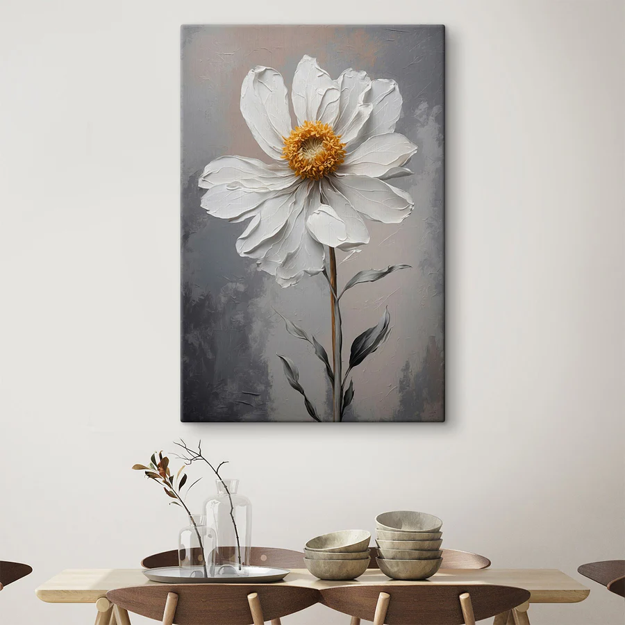 Înveseliți orice colț plictisitor cu această imprimare uimitoare pe pânză a unei flori albe, cu un centru galben vesel. Este ca și cum ai aduce o bucățică de natură în casă, fără să-ți faci griji pentru udarea ei! Imaginați-vă-o agățată într-o cameră de zi confortabilă sau poate deasupra unui colț de lectură senin. De fiecare dată când cineva trece pe lângă ea, s-ar putea să se gândească de două ori, crezând că este o floare proaspătă! Tonurile blânde din fundal îi sporesc farmecul, făcând-o să se potrivească perfect cu diferite stiluri de decor. Este un mod minunat de a stârni conversația și de a înveseli atmosfera. Așa că dați-i drumul, lăsați această frumusețe florală să adauge o notă de viață spațiului dumneavoastră!