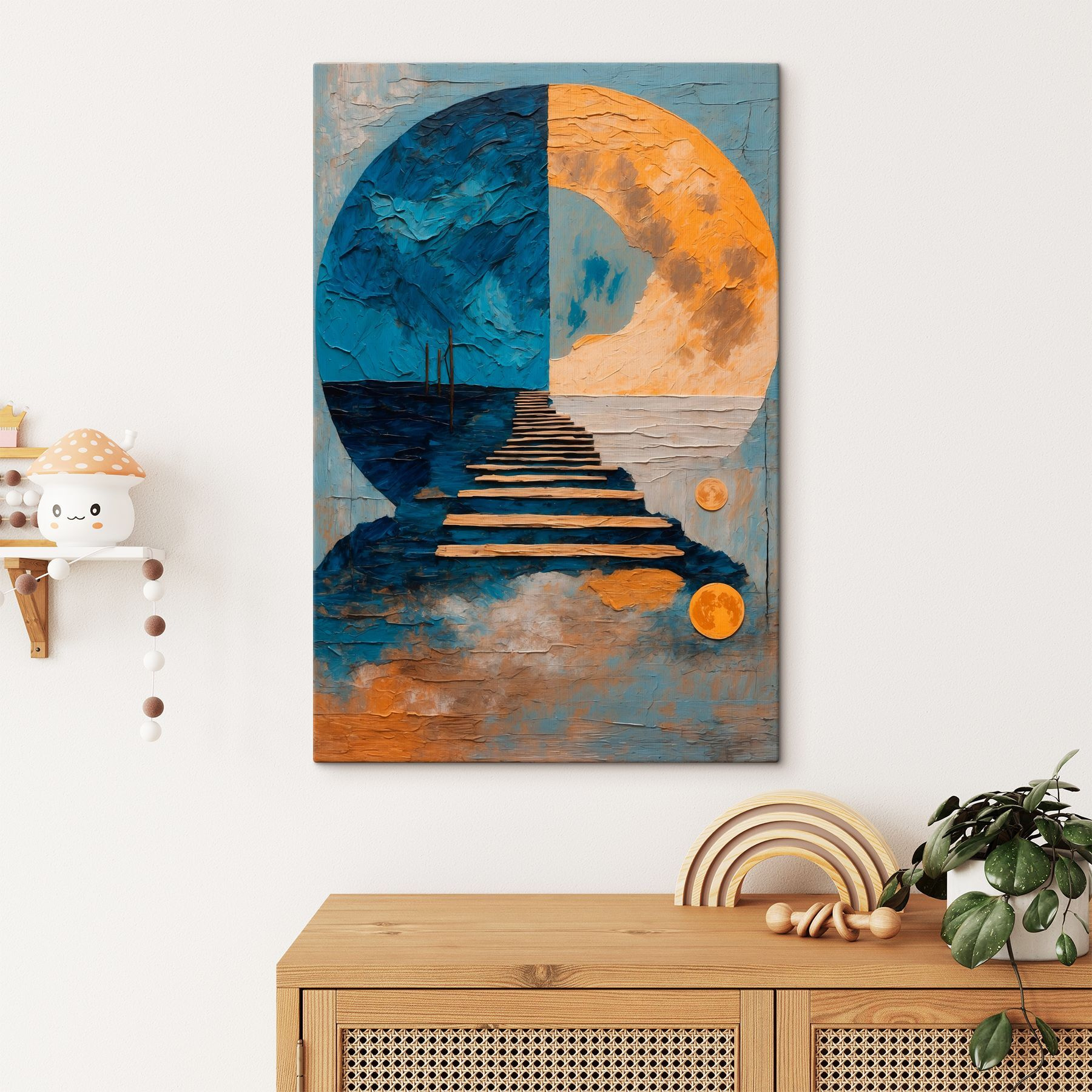 Imaginați-vă o scară de vis care duce direct la lună – cât de sălbatic este asta? Această imprimare pe pânză captează o vibrație senină, dar aventuroasă, care poate transforma orice cameră. Amestecul de albastru și nuanțe calde aurii se simte ca o îmbrățișare blândă pentru pereții dvs. Imaginați-vă această piesă deasupra canapelei, stârnind conversații sau chiar vise cu ochii deschiși despre nopțile înstelate. Are acea notă perfectă de fantezie, în timp ce încă se simte elegant, ca puloverul tău confortabil preferat. Fie că este pentru o retragere pe plajă sau un studiu liniștitor, aduce un pic de natură și magie în interior. Cine nu și-ar dori să meargă pe scara aceea, chiar dacă doar în imaginație?
