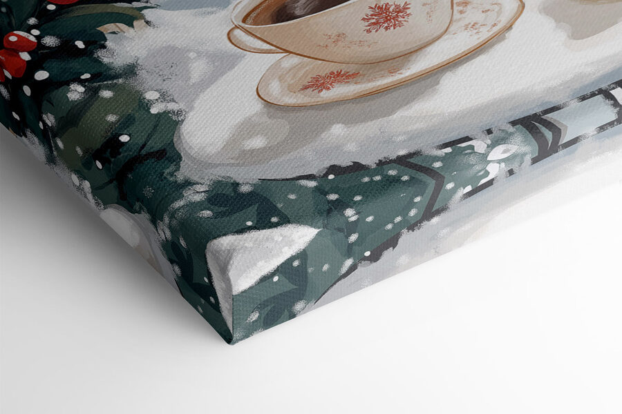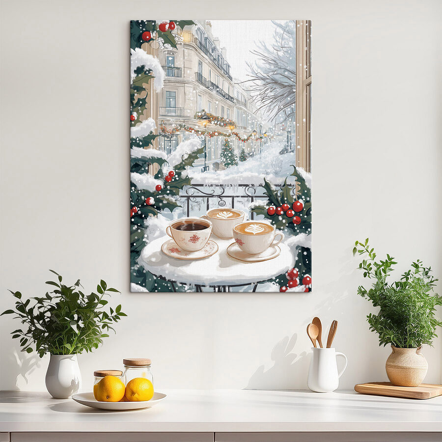 Imaginați-vă că savurați o ceașcă de cafea preparată perfect, stând pe un balcon confortabil, în timp ce fulgii de zăpadă cad ca niște steluțe strălucitoare. Această imprimare pe pânză surprinde frumos acel moment. Cu două cești elegante așezate pe o masă fermecătoare, scena vă invită să faceți o pauză și să inspirați aroma cafelei proaspete, amestecată cu răcoarea iernii. Imaginați-vă această priveliște încântătoare atârnând în sufrageria dvs.; este ca o îmbrățișare caldă într-o zi rece. Cu siguranță va stârni conversații despre diminețile leneșe și visele de iarnă, infuzând spațiul dvs. cu căldură, farmec și doar o urmă din magia sărbătorilor. Perfect pentru iubitorii de cafea bună și minunile iernii!