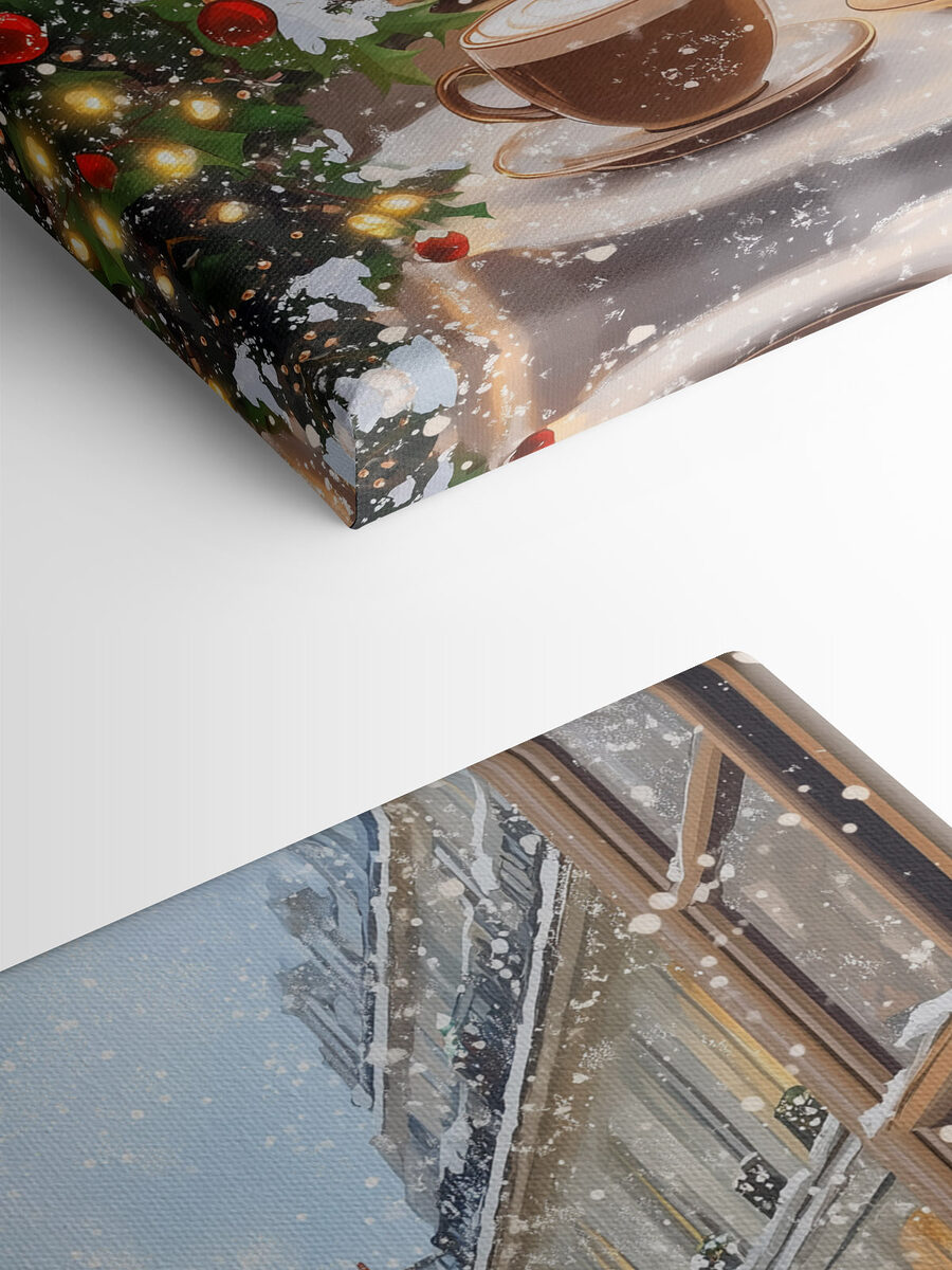 Imaginați-vă că vă simțiți confortabil lângă această imprimare pe pânză, unde două cești calde de cafea sunt așezate în mod atrăgător pe o scenă stradală acoperită de zăpadă. Este ca și cum te-ai uita pe fereastră într-o zi răcoroasă, cu lumini strălucitoare și veselie de sărbători în jurul tău. Aroma de cafea proaspătă se răspândește în jur, umplând spațiul cu căldură și confort. Această imprimare nu doar decorează un perete, ci stârnește visuri cu ochii deschiși despre discuții înduioșătoare la cafea, râsete cu prietenii sau dimineți liniștite în care priviți cum cad fulgii de zăpadă. Perfectă pentru o bucătărie sau un colț confortabil, te face să zâmbești de fiecare dată când treci pe lângă ea.