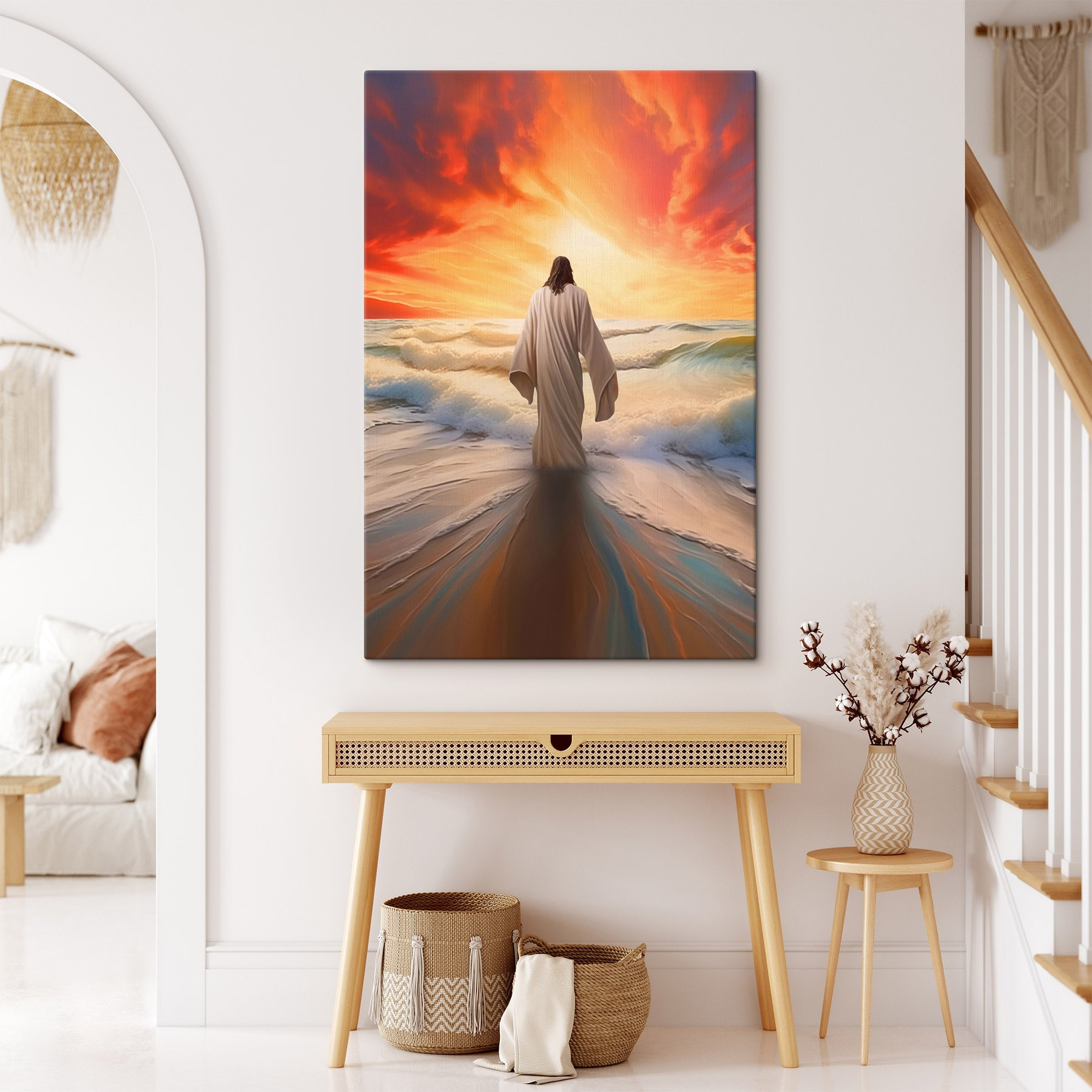 Imaginați-vă această imprimare uimitoare pe pânză agățată în camera dvs. de zi, transformând instantaneu atmosfera. Este ceva captivant la o figură în halat care stă liniștită în apă, încadrată de un apus de soare dramatic. Se simte ca un moment de pace, un memento blând pentru a respira și a îmbrățișa frumusețea vieții. Imaginați-vă prieteni care se uită la ea, împărtășind povești sau pur și simplu absorbind culorile – portocaliu strălucitor, albastru suav, strălucirea valurilor blânde. Această piesă invită la reflecții despre natură, seninătate și poate chiar la o mică cercetare a sufletului. Este mai mult decât un decor; este un starter de conversație, o felie de calm într-o lume aglomerată – perfectă pentru orice iubitor al naturii sau pentru oricine are nevoie de o amintire zilnică a seninătății.