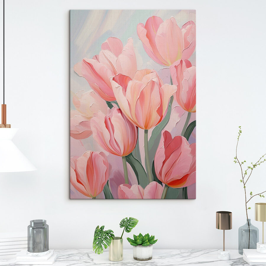 Transformați-vă spațiul cu aceste lalele delicate de culoare roz, care surprind esența unei dimineți blânde de primăvară. Cu nuanțe delicate și petale grațioase, această pânză aduce un suflu de aer proaspăt în orice încăpere. Imaginați-vă că vă treziți înconjurați de frumusețea lor – este ca și cum ați avea o mini-grădină chiar pe perete! Perfecte pentru colțuri confortabile sau sufragerii elegante, aceste flori fac ca fiecare moment să fie special. În plus, cine nu ar zâmbi la vederea unor lalele atât de frumoase? Sunt ca o îmbrățișare pentru pereții dvs., aducând căldură, bucurie și un strop de natură în viața dvs. Totul ține de vibrații, nu-i așa?