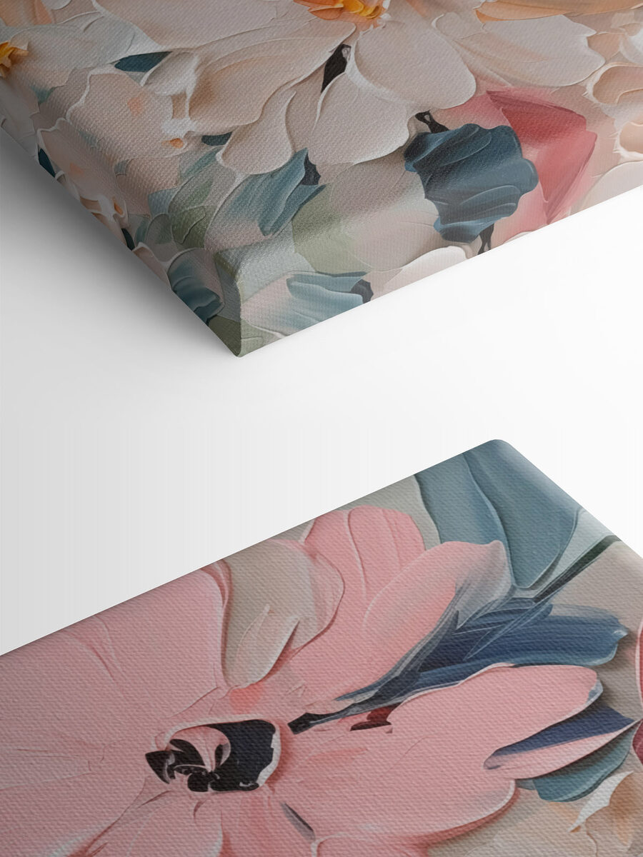 Înveseliți orice spațiu cu această încântătoare „Tablou cu flori pe pânză”. Este ca o grădină veselă care înflorește chiar pe peretele dvs., plină de nuanțe delicate de roz, alb cremos și accente de coral. Imaginați-vă această frumusețe care vă întâmpină în fiecare dimineață – ce mod minunat de a începe ziua! Textura îi dă viață, aproape că îți vine să întinzi mâna și să atingi acele flori. Perfectă pentru un living confortabil sau un dormitor liniștit, adaugă un strop de natură fără a fi nevoie să ai mâna verde. Cui nu-i place un pic de stil floral? Nu este doar artă, este un stimulent pentru starea de spirit!
