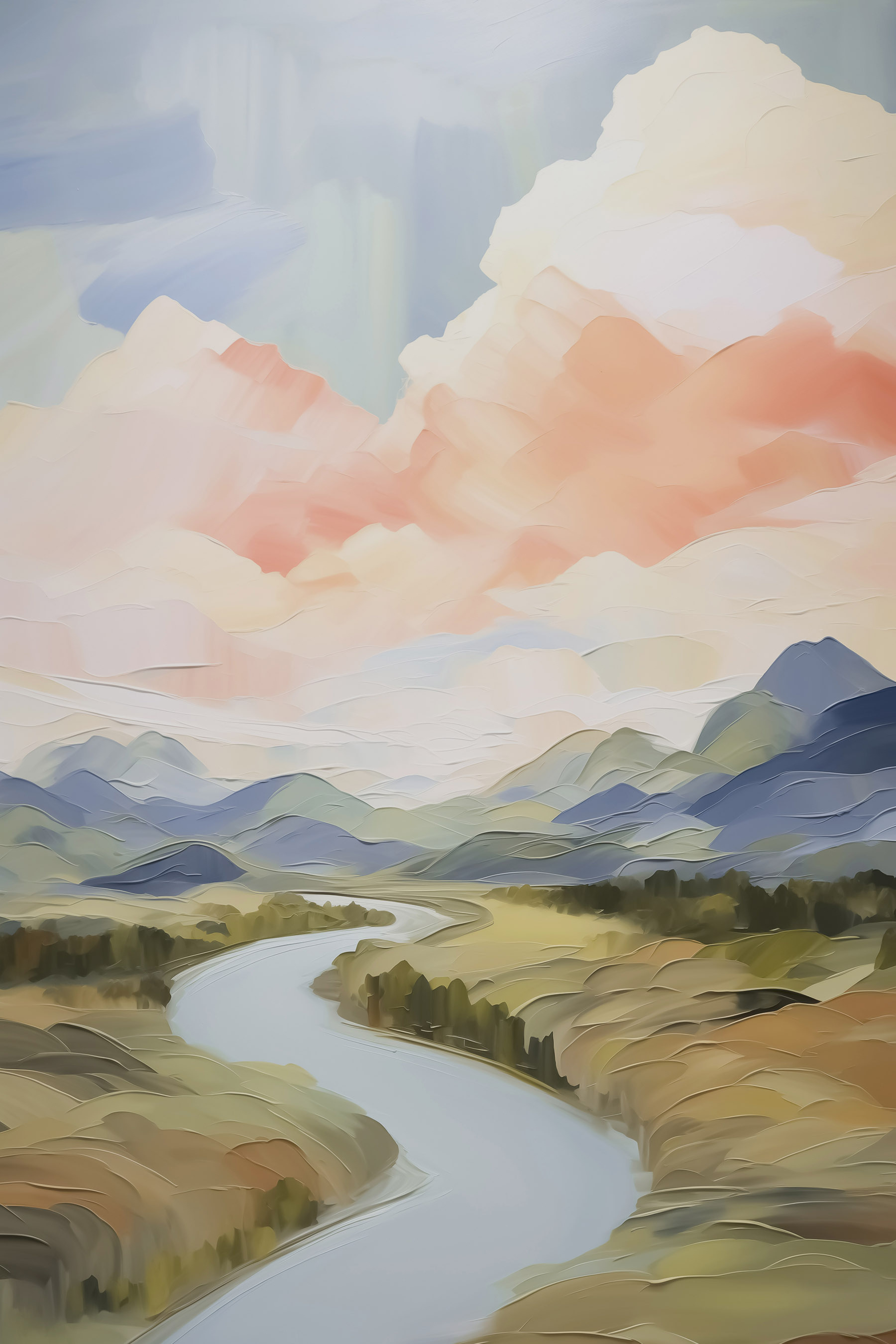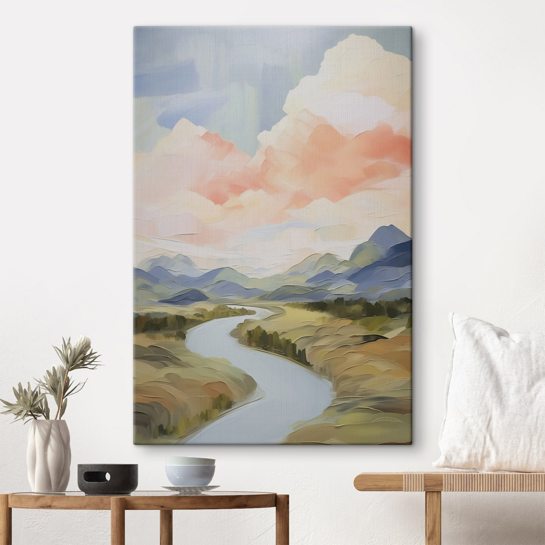 Transformați-vă spațiul cu „Canvas Prints River Running Through a Valley” (Tablou pe pânză „Râu curgând printr-o vale”). Această lucrare surprinde fluxul liniștit al naturii, unde râul curge fără efort prin văi luxuriante. Imaginați-vă că stați relaxat cu o ceașcă de cafea caldă, bucurându-vă de nuanțele delicate de albastru și verde pământiu, în timp ce curbele blânde ale râului vă transportă într-o după-amiază liniștită.