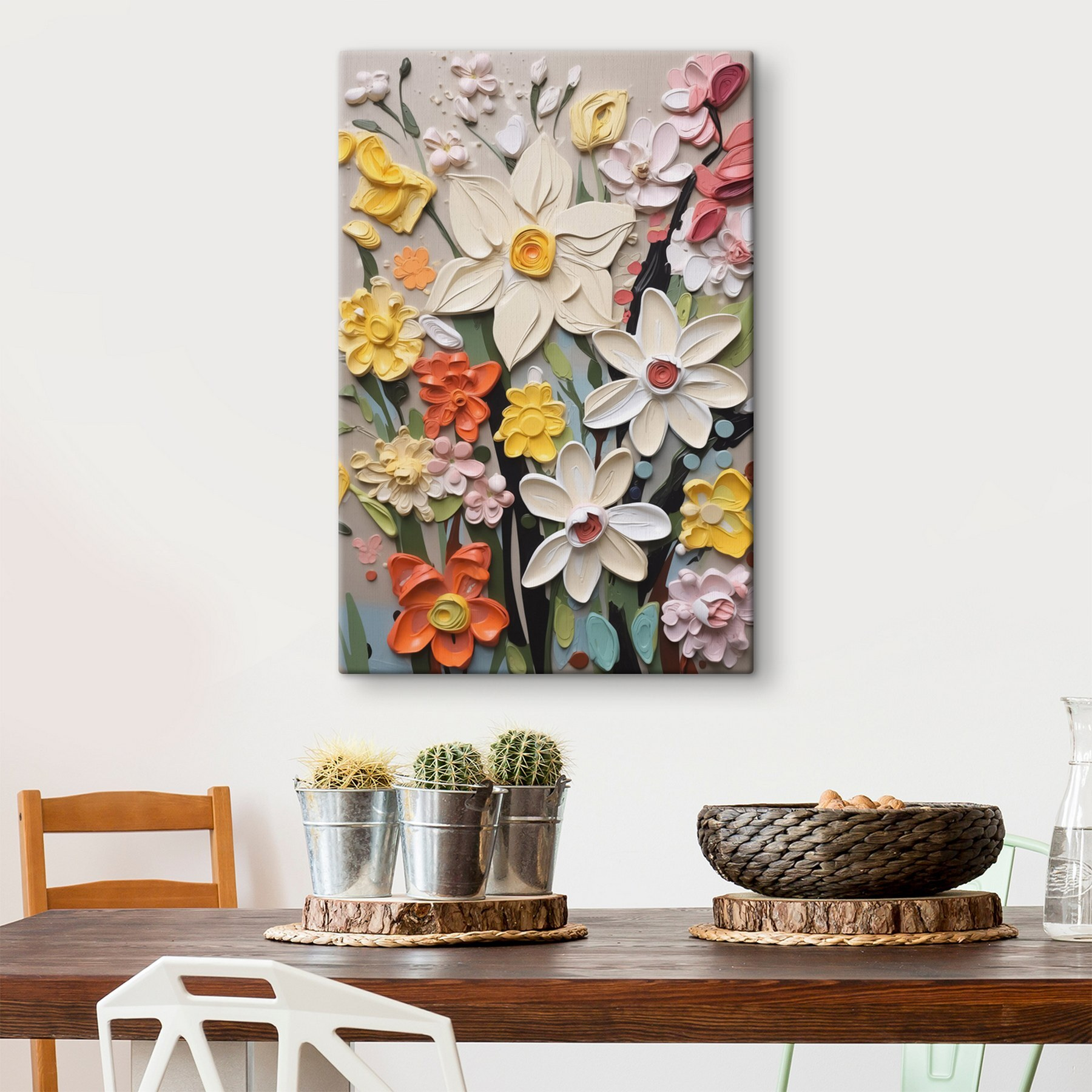 Înveselește orice cameră cu această imprimare vibrantă pe pânză cu flori, care te va face să te simți ca și cum ai pășit într-o grădină scăldată de soare. Fiecare floare pare să danseze vesel pe pânză, plină de culoare. Are o textură jucăușă care te invită să o atingi – serios, este aproape ca o mini capodoperă artistică. Imaginați-vă că savurați o cafea într-o dimineață leneșă, bucurându-vă de frumusețea sa. Este ca și cum ați avea propria florărie pe perete, fără alergiile la polen! Perfectă pentru a adăuga o notă veselă, cu siguranță va fi un subiect de conversație. Cine nu și-ar dori o explozie de bucurie florală chiar acasă?