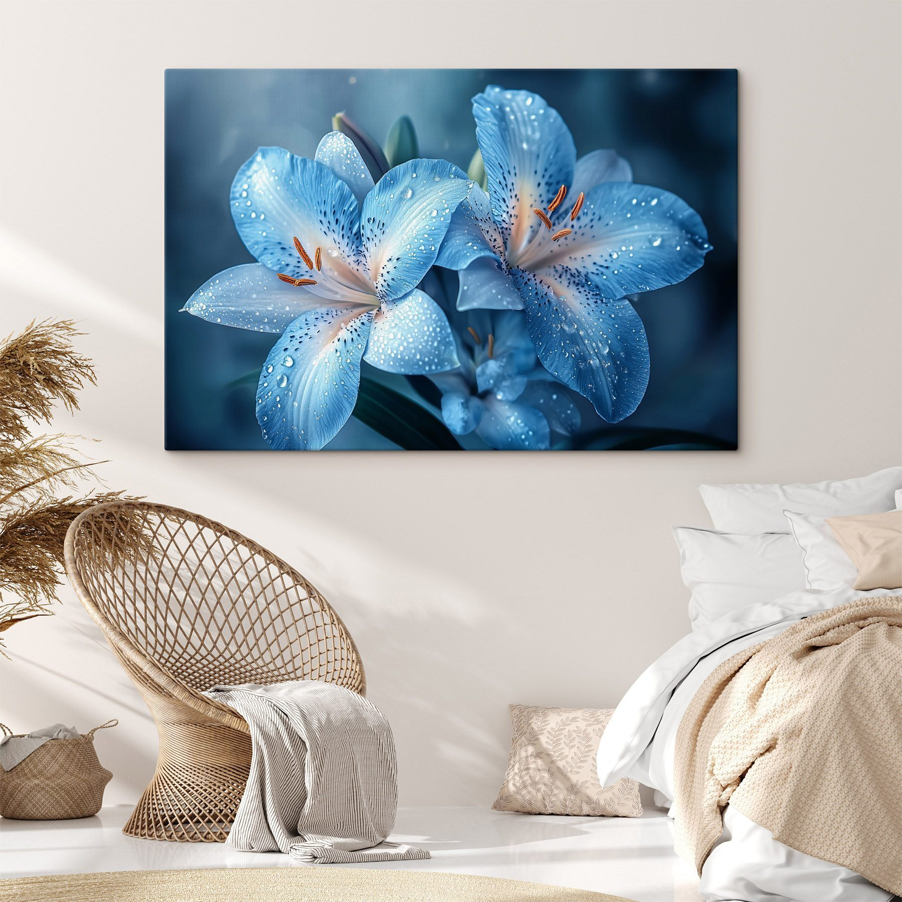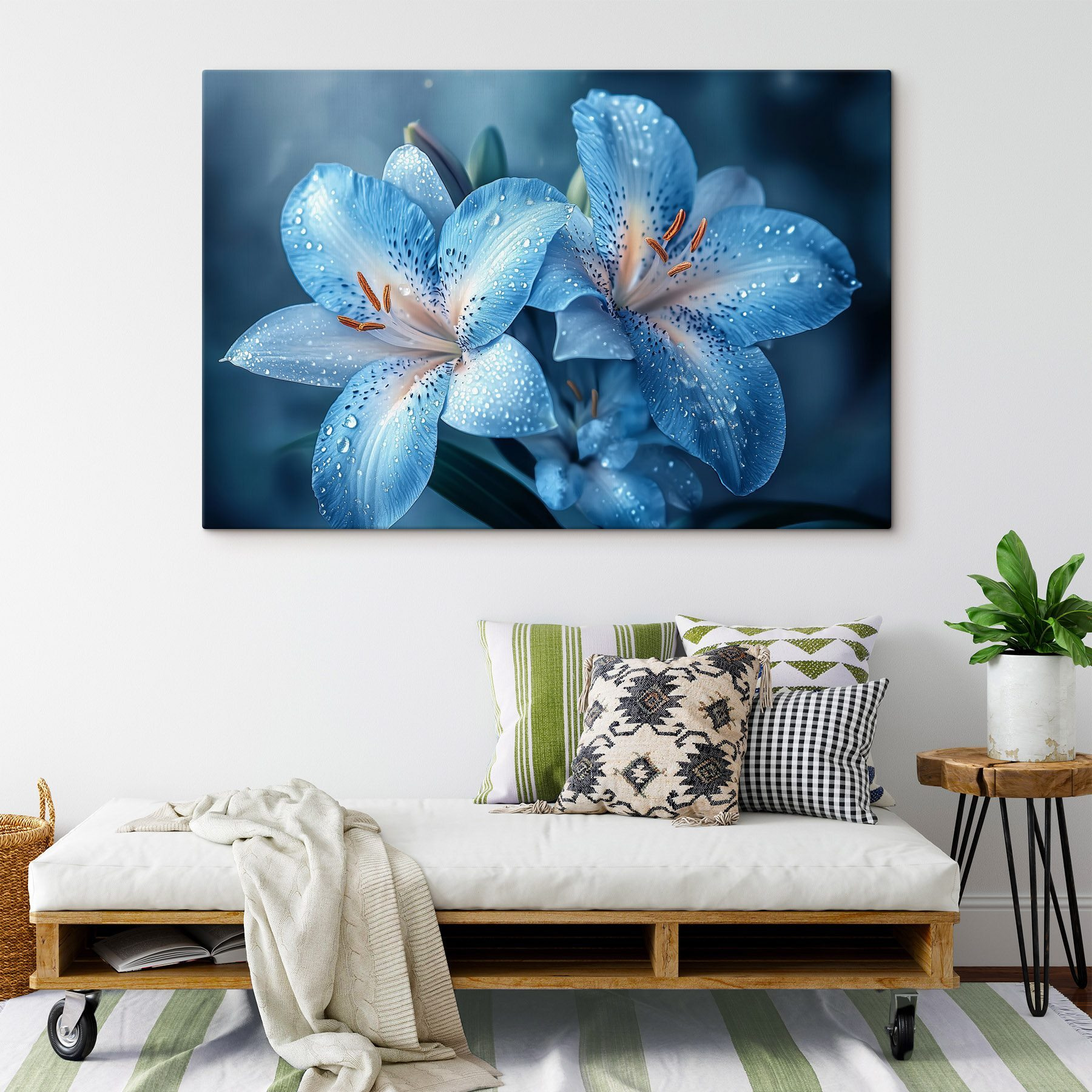 Meet the “Delicate Blooms in Vibrant Hues”—a canvas print that practically radiates joy! Imagine walking into a room and being greeted by lush blue lilies glistening with dewdrops, as if they’ve just whispered sweet secrets to the morning sun. This captivating art piece is not just decor; it’s a burst of nature that’s here to cheer you up. Whether it hangs above your cozy reading nook or brightens up a dull hallway, it brings an airy vibe that makes you wanna take a deep breath and smile. Say goodbye to boring walls and hello to a floral fiesta! Perfect for anyone who loves a touch of whimsy in their space. Trust me, your walls will thank you!