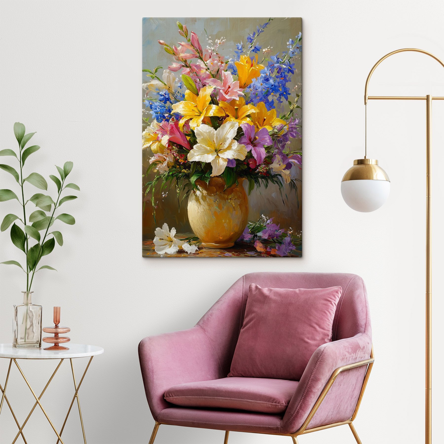 Înveseliți-vă spațiul cu această imprimare pe pânză care prezintă un buchet uimitor de flori într-o vază. Imaginați-vă că veniți acasă după o zi lungă și sunteți întâmpinați de flori vibrante care vă șoptesc: „Luați-vă un moment. Bucură-te de viață”. Această piesă emană o atmosferă caldă și un plus de farmec, perfectă pentru orice cameră – sufragerie, dining sau chiar colțul confortabil în care savurezi cafeaua de dimineață. Este ca și cum ai avea o mică grădină în interior, fără udat și fără insecte enervante. În plus, cui nu-i plac florile care nu se ofilesc? Agăț-o și lasă culorile vesele să-ți aducă bucurie și să-ți inspire amintiri.