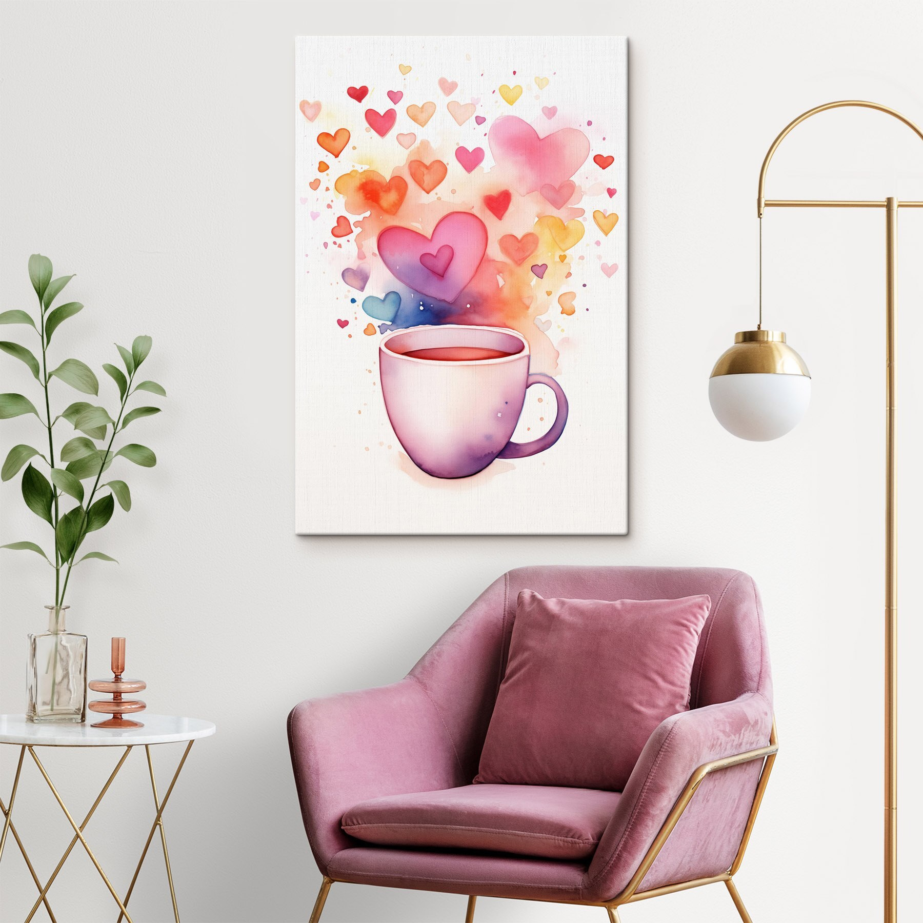 Brighten up your space with this charming canvas print, aptly named “Cup of Tea with Hearts.” It’s like a warm hug in watercolor form! Picture it hanging on your wall, radiating cozy vibes, with hearts fluttering around a lovely tea cup. Every time that morning cup of joy hits, you’ll be reminded of simple pleasures—maybe that perfect rainy day or a moment spent with good company. It’s not just decor; it’s a small slice of happiness for your home. With its splash of color and gentle whimsy, this print effortlessly invites love and warmth into any room. Who doesn’t need a little extra heart in their life?
