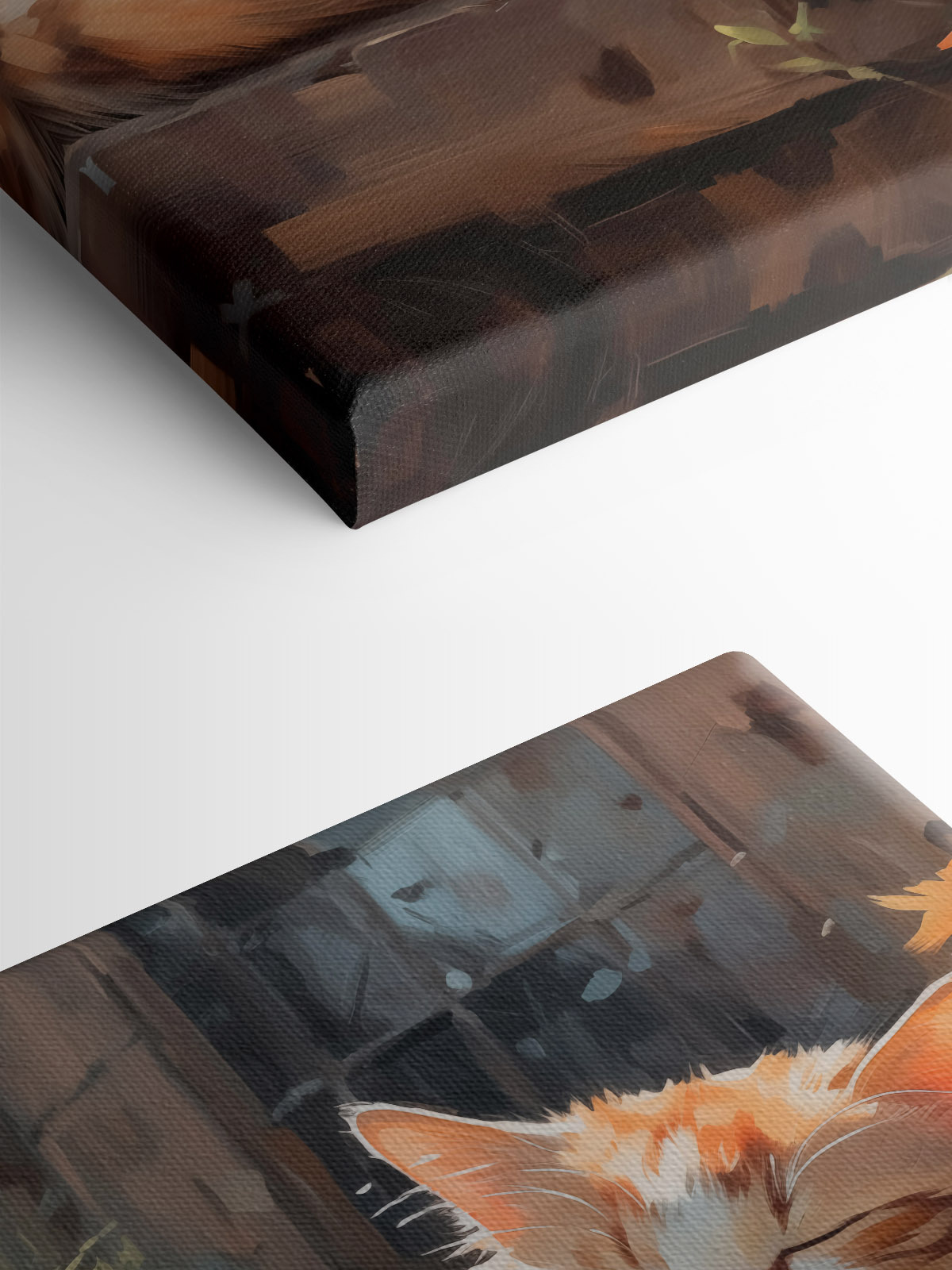 Imaginați-vă o după-amiază însorită, când lumea din afară încetinește puțin. Această imprimare pe pânză, „Cat Lying on a Ledge” (Pisică întinsă pe o cornișă), surprinde perfect această atmosferă relaxată. Cu blana sa portocalie moale și expresia de satisfacție pură, această pisică pare că visează să vâneze fluturi sau poate că plănuiește următorul său jaf de gustări. Verdele luxuriant și lumina caldă a soarelui aduc o notă veselă oricărei camere, făcând-o să pară confortabilă și primitoare. Agățați-l în spațiul dvs. de locuit și va fi ca și cum ați primi un prieten pufos care știe întotdeauna cum să doarmă la momentul potrivit. Este genul de artă care vă face să zâmbiți, ca o reamintire blândă să vă opriți o clipă și să respirați. În plus, cine nu iubește o pisică care pare atât de relaxată?