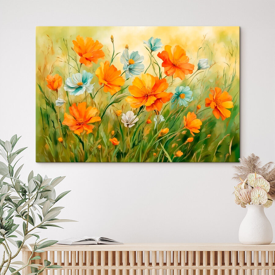 Înveseliți orice spațiu cu această superbă imprimare pe pânză, cu flori portocalii vii și albe delicate. Este ca o petrecere în grădină, dar fără țânțari! Fiecare floare strălucește cu căldură, invitând un sentiment de bucurie și seninătate în casa dvs. Imaginați-vă-l atârnat într-un colț confortabil, unde vă serviți cafeaua de dimineață și vă bucurați de frumusețea lui. Perfect pentru a înfrumuseța sufrageria sau pentru a adăuga un strop de culoare dormitorului. Această piesă nu stă doar pe perete, ci aduce natura în interior, fără efort. Cine ar fi crezut că florile pot fi o companie atât de plăcută?