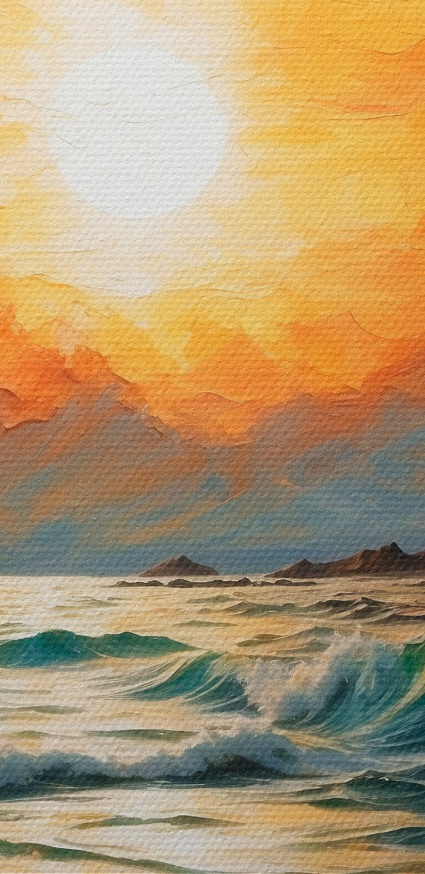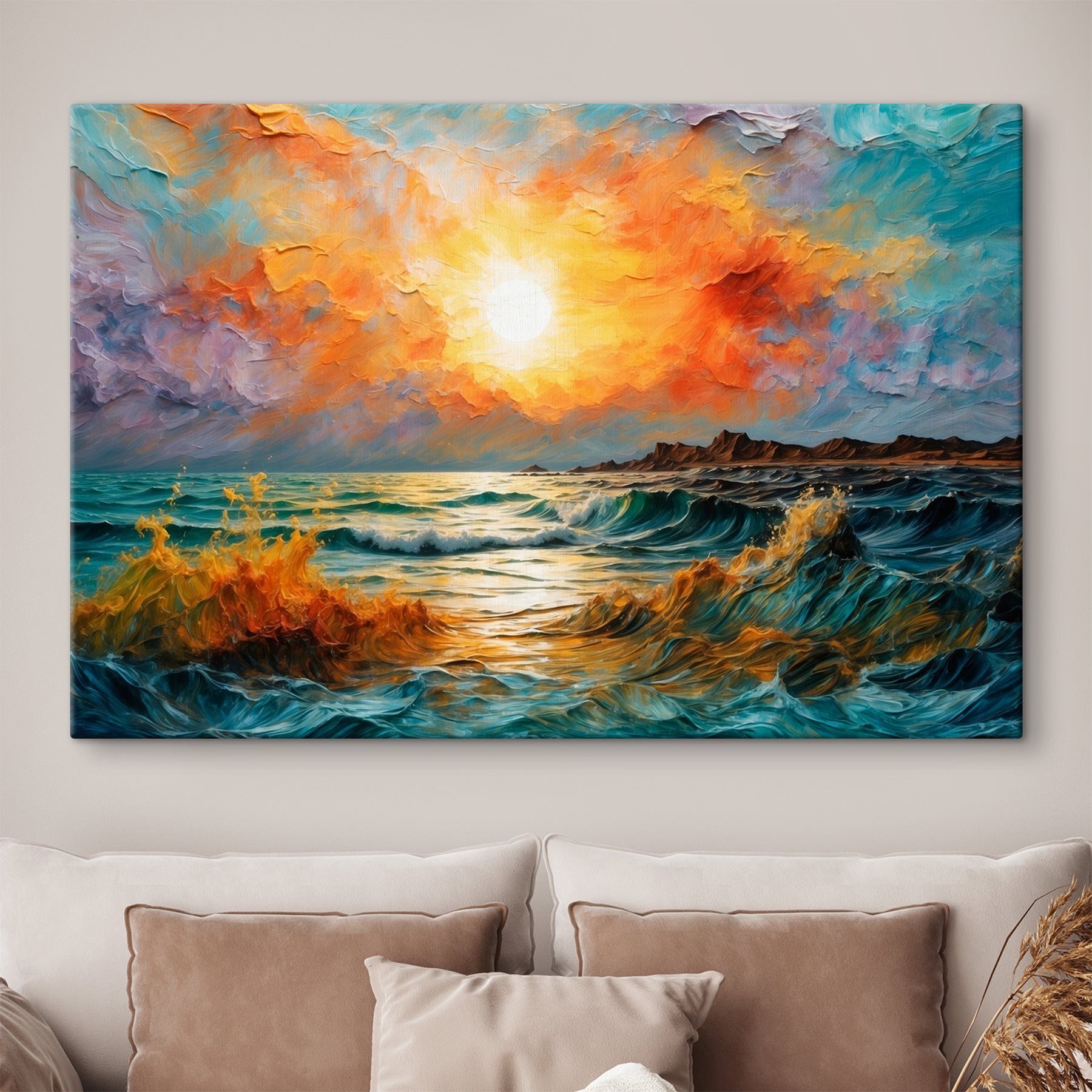 Adu căldura apusului de soare direct în casa ta cu această uimitoare imprimare pe pânză. Imaginează-ți că vii acasă după o zi lungă și ești întâmpinat de o explozie de culori vibrante care se reflectă în apele liniștite. Portocaliul și albastrul intens te invită să faci o pauză, să respiri și să uiți de lista interminabilă de lucruri de făcut. E ca și cum ai avea o bucată de paradis pe perete – fără să ai nevoie de loțiune de protecție solară!