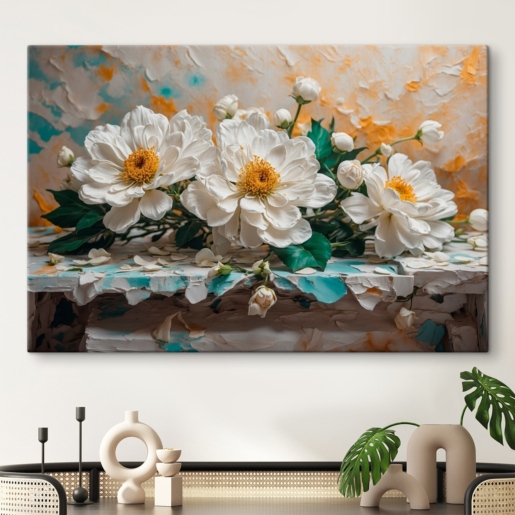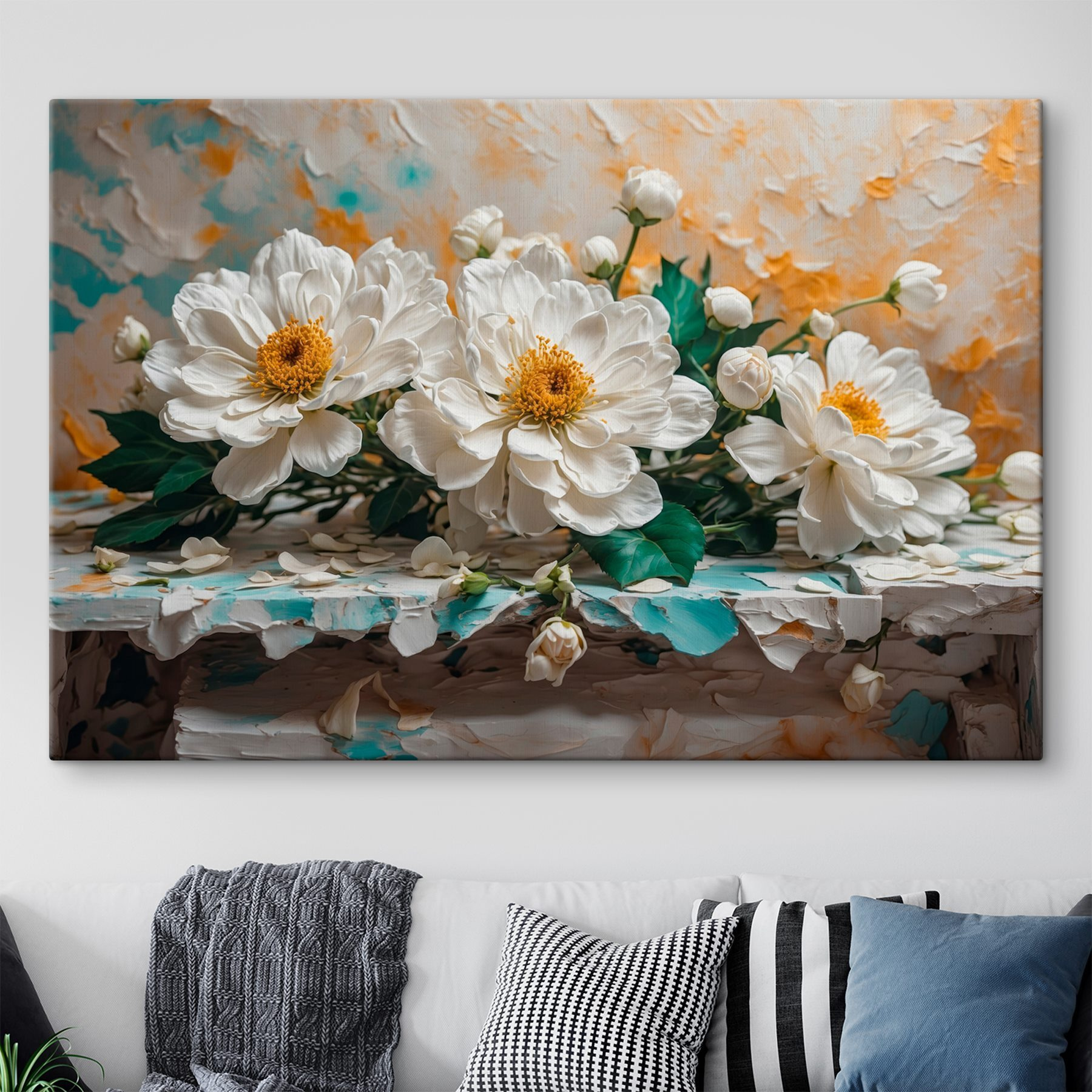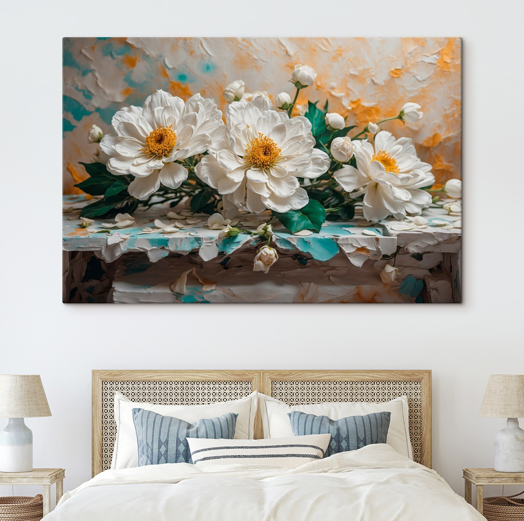 Înveselește orice spațiu cu această frumoasă imprimare pe pânză, care prezintă un buchet de flori albe. Ea aduce un sentiment de calm și aer proaspăt pe pereții tăi. Imaginează-ți că intri într-o cameră și simți că ai pășit într-o grădină liniștită, cu petale moi și culori delicate care îți șoptesc relaxare.
