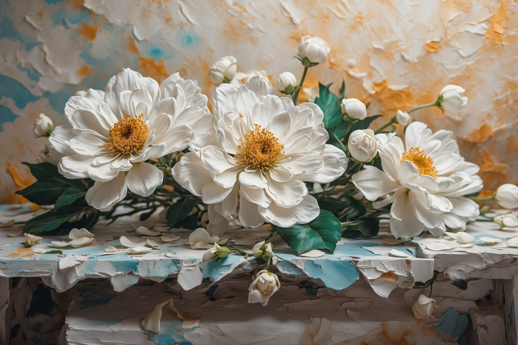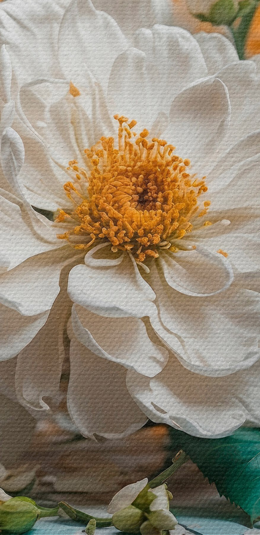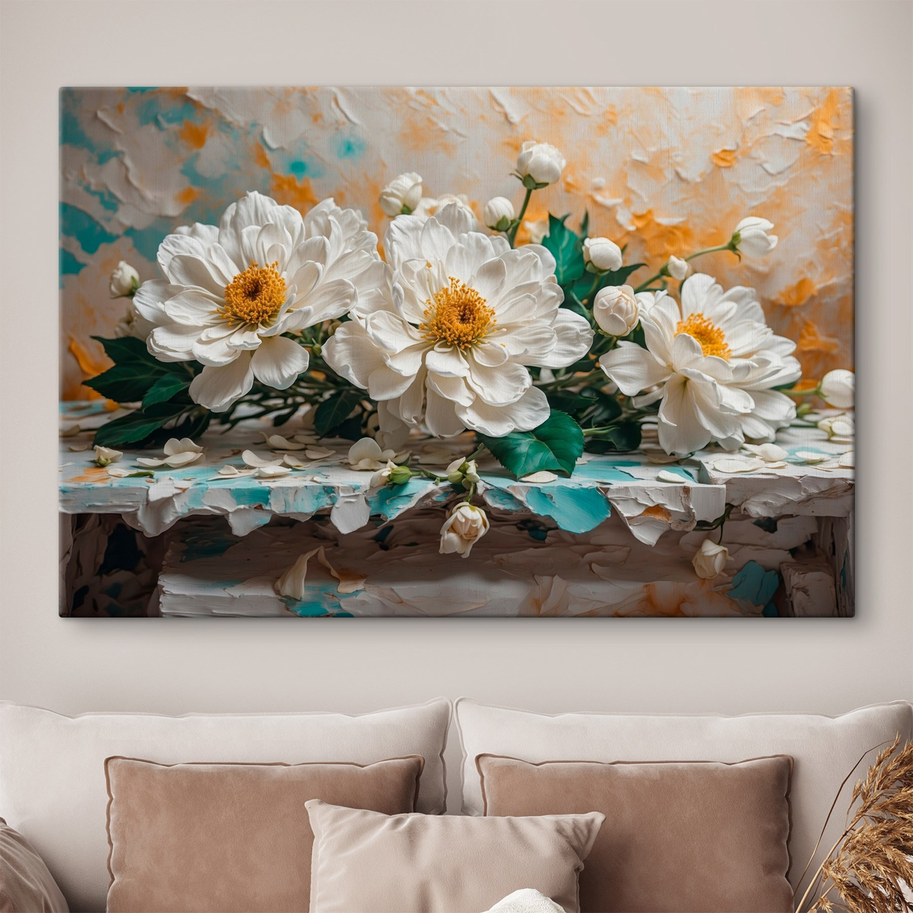 Înveselește orice spațiu cu această frumoasă imprimare pe pânză, care prezintă un buchet de flori albe. Ea aduce un sentiment de calm și aer proaspăt pe pereții tăi. Imaginează-ți că intri într-o cameră și simți că ai pășit într-o grădină liniștită, cu petale moi și culori delicate care îți șoptesc relaxare.