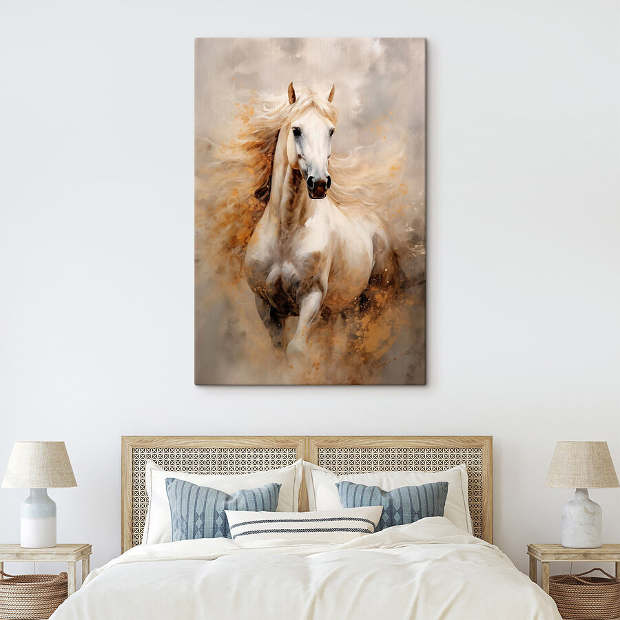 Transformați-vă spațiul cu această uimitoare imprimare pe pânză a unui cal alb maiestuos, cu coama sa fluturândă care parcă șoptește secrete ale aventurilor sălbatice. Această piesă nu este doar un obiect decorativ agățat pe perete, ci captivează inima. Imaginați-vă că treceți pe lângă ea și aruncați o privire, de parcă ar putea galopa direct în sufrageria dvs. — sau poate chiar ar putea servi ca un subiect perfect de conversație pentru oaspeții care iubesc magia ecvestră. Nuantele delicate dansează în lumină, creând o atmosferă de vis. O notă de eleganță, un strop de spirit sălbatic — perfect pentru oricine dorește să adauge un pic de personalitate decorului său.