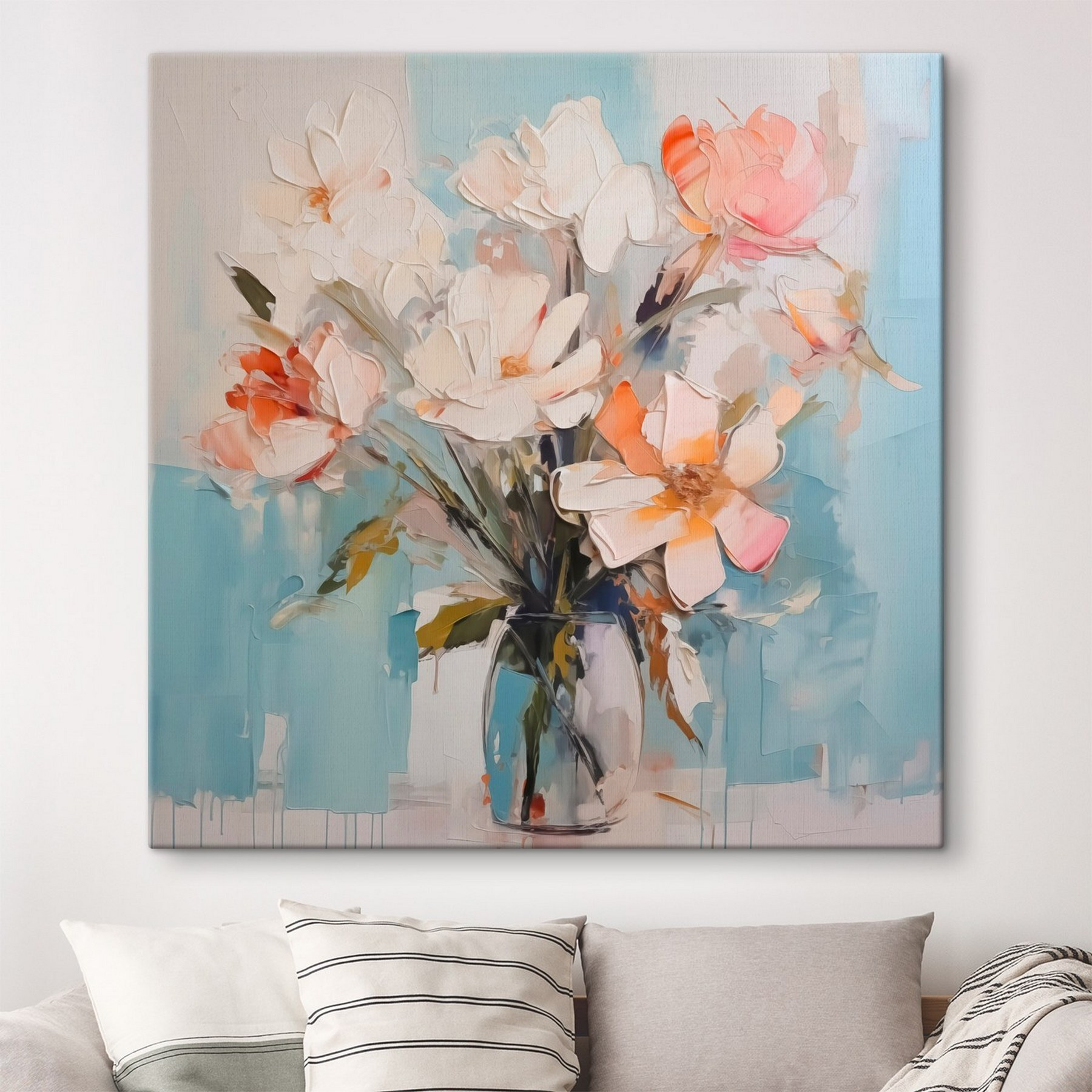 Transformați orice spațiu cu acest print pe pânză vibrant cu flori într-o vază. Imaginați-vă că intrați într-o cameră și sunteți întâmpinați de o explozie de petale și culori vii – este ca și cum o mică grădină vă întâmpină acasă. Pastelurile moi dansează pe un fundal albastru rece, creând o atmosferă senină. Fiecare privire aruncată asupra acestei piese ar putea stârni un zâmbet sau chiar un vis cu ochii deschiși la zile însorite. Perfectă pentru a lumina un colț liniștit sau pentru a adăuga farmec unui colțișor confortabil, este o atingere încântătoare care șoptește căldură și farmec. Cui nu i-ar plăcea un pic de natură în interior?