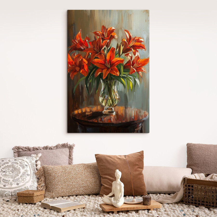 Aduceți un plus de energie vibrantă în orice spațiu cu această uimitoare imprimare pe pânză cu flori portocalii într-o vază de sticlă. Aceste flori parcă sar din pânză – îndrăznețe, strălucitoare și pline de personalitate! Imaginați-vă această operă de artă atârnată într-un colț confortabil sau într-o sufragerie plină de viață, unde oricine trece pe lângă ea nu poate să nu zâmbească. Este ca și cum ați avea o mică bucată de natură capturată în vopsea, gata să înveselească o zi ploioasă. Vaza de sticlă adaugă o notă de eleganță, creând un amestec perfect de farmec și veselie. Cine ar fi crezut că florile pot fi atât de înveselitoare?