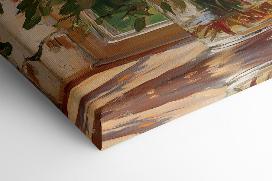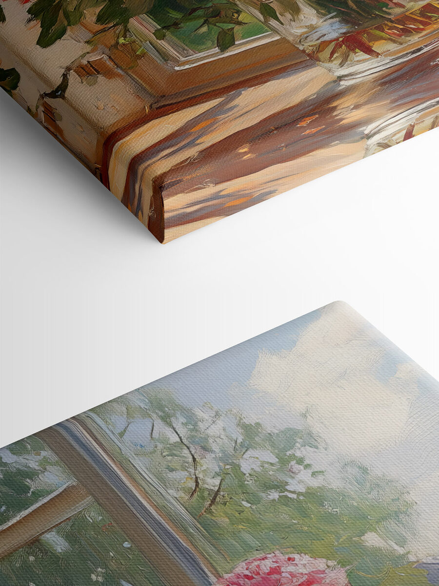 Înveseliți orice cameră cu printul pe pânză „Vaza cu flori în fața ferestrei”. Această piesă nu este doar un obiect decorativ, ci o experiență. Imaginați-vă că vă relaxați într-o după-amiază plăcută, cu razele soarelui pătrundând în cameră, în timp ce aceste flori frumoase vă amintesc de o zi însorită în grădină. Nuantele delicate de roz și alb ies în evidență pe fundalul relaxant, dând senzația că primăvara a decis să rămână pentru totdeauna. Perfectă pentru sufragerie, biroul de acasă sau chiar un colț confortabil pentru citit. Este ca și cum ai avea o bucată de natură în interior, fără alergii! Atmosfera veselă pe care o creează s-ar putea să vă inspire un zâmbet sau două, sau chiar să vă facă să doriți o ceașcă de ceai. Sincer, cui nu i-ar plăcea asta?