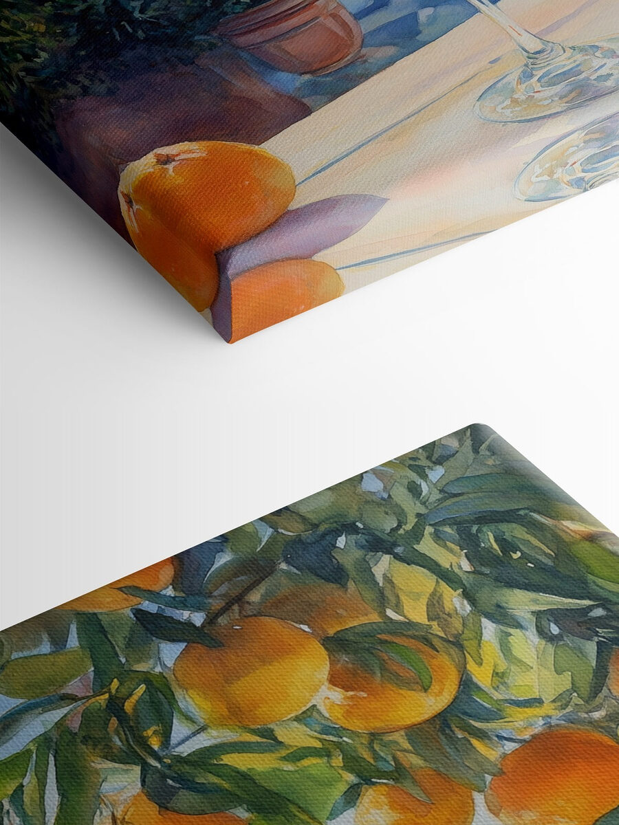 Înveselește orice încăpere cu această imprimare veselă pe pânză, reprezentând un pahar răcoritor de suc de portocale, așezat printre portocale proaspete. Este ca o mini-vacanță pentru peretele tău, amintindu-le tuturor de după-amiezile însorite și de brunch-urile leneșe. Imaginați-vă că sorbiți o băutură răcoritoare, soarele vă încălzește fața, iar aroma picantă a portocalelor dansează în aer. Adaugă o notă de culoare și o bucată de bucurie, perfectă pentru bucătării, sufragerii sau acel loc gol care cere farmec. Cine nu ar zâmbi la asta? Adăugați un pic de vară decorului dvs., fără a fi nevoie de protecție solară!