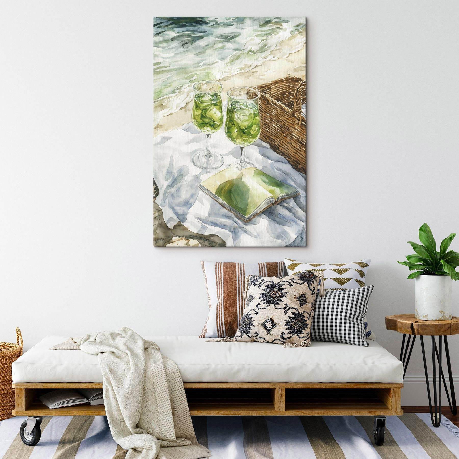 Aduceți un plus de serenitate în orice încăpere cu această superbă imprimare pe pânză în acuarelă. Imaginați-vă: două pahare de vin răcoritor, un coș de picnic confortabil și o carte care așteaptă să fie deschisă, toate pe fundalul unor valuri line. Este ca o invitație la după-amieze relaxante petrecute la soare, savurând fiecare înghițitură și fiecare cuvânt. Perfectă pentru bucătării, sufragerii sau orice alt loc de relaxare, această piesă trezește bucurie, nostalgie și poate chiar și puțină dor de ducă. Este o artă care șoptește: „Ia o pauză, o meriți!” Cu culorile sale delicate și scena primitoare, este sigură că va face pe oricine să zâmbească și să viseze la picnicuri pe malul mării. Perfect imperfectă, exact ca viața.