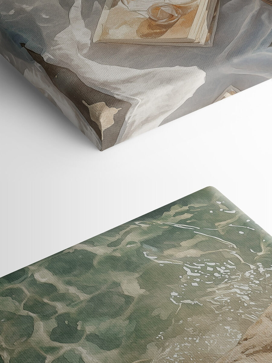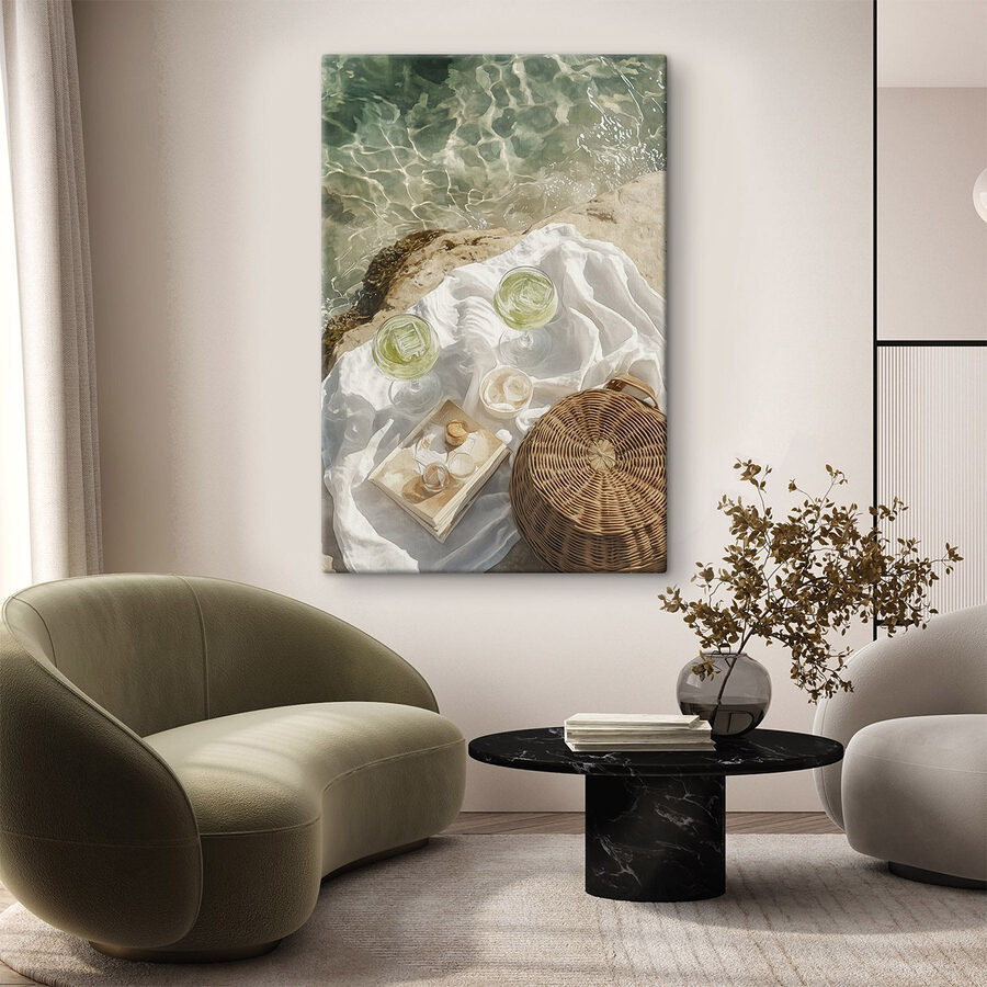 Imaginați-vă această scenă încântătoare care vă înveselește spațiul – un coș de picnic și pahare strălucitoare cu vin așezate pe o stâncă scăldată de soare, cu apele liniștitoare ca fundal. Ea șoptește după-amieze leneșe de vară și escapade spontane. Această imprimare pe pânză surprinde cu ușurință esența momentelor frumoase, invitând pe oricine o vede să viseze cu ochii deschiși la propria mini-escapadă. La fiecare privire, aproape că puteți auzi râsetele amestecându-se cu valurile blânde.