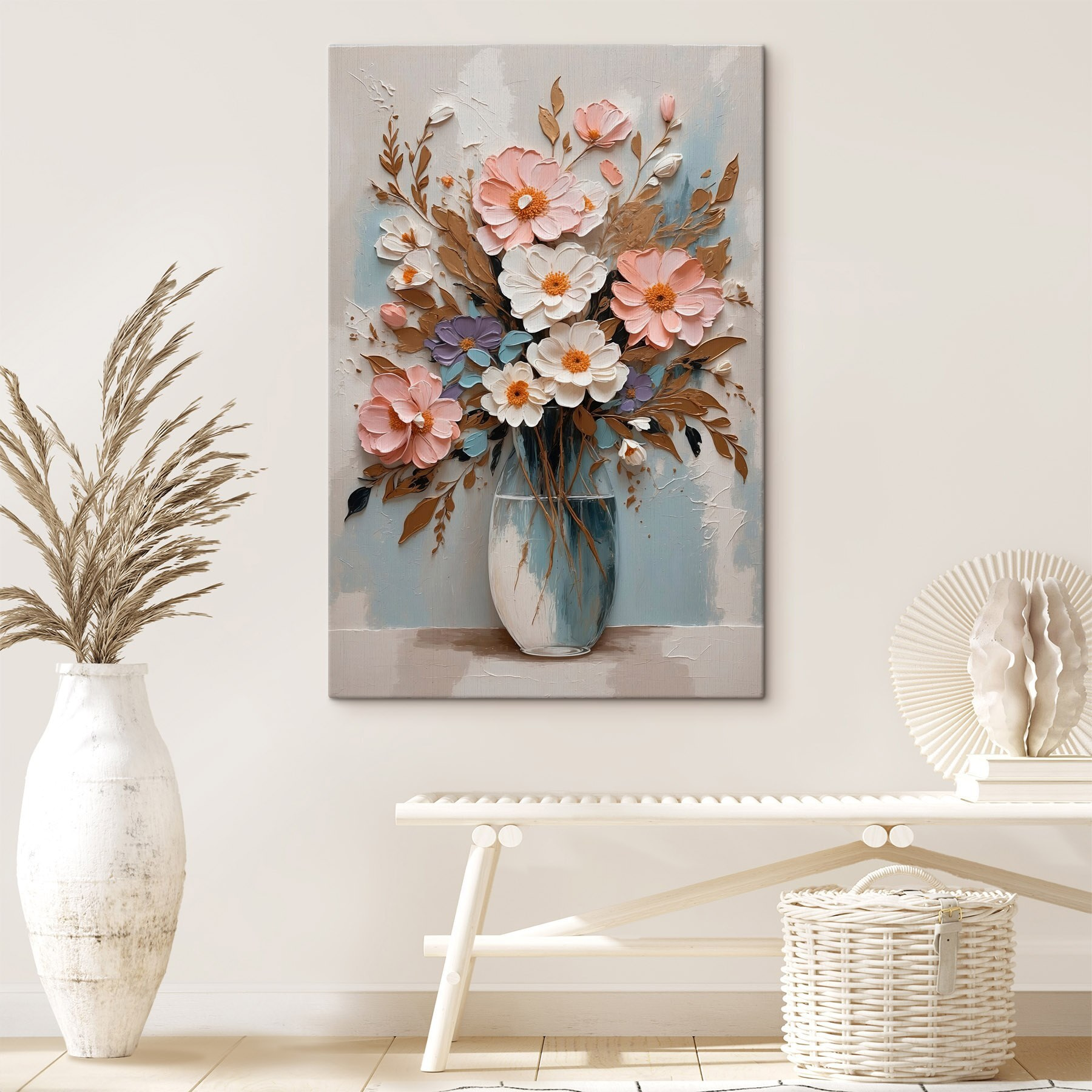 Luminează-ți spațiul cu acest print pe pânză plin de viață cu flori într-o vază, un accesoriu fermecător care emană căldură și veselie. Imaginați-vă-o deasupra canapelei sau într-un colț confortabil – ridică imediat starea de spirit, nu-i așa? Aceste flori jucăușe, pictate cu atâta fler, par să se legene ușor, invitând bucuria în cameră. Este ca și cum ai avea o mică grădină în interior, fără a fi nevoie să o uzi. Prietenii ar putea să se oprească, să inhaleze adânc și să zâmbească. Perfectă pentru a adăuga acea notă de personalitate oricărui perete, această piesă șoptește: “Viața este prea scurtă – bucurați-vă de frumusețe!” Oferiți pereților dvs. ceva despre care să discutați.