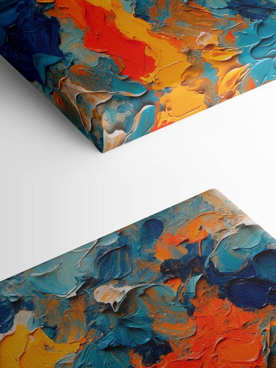 Scufundați-vă într-o mare de culoare cu această imprimare abstractă vibrantă pe pânză! Este ca o conversație plină de viață pe peretele dvs. – fiecare vârtej și strop vă invită să pășiți într-o lume a imaginației. Imaginați-vă-o deasupra canapelei, transformând spațiul din obișnuit în extraordinar. Prietenii se vor opri la jumătatea propoziției, cu ochii măriți, pe măsură ce se vor pierde în haosul de nuanțe. Amestecul de albastru, portocaliu și galben va aduce căldură și energie în orice cameră, devenind un fundal perfect pentru nopțile confortabile sau pentru întâlnirile pline de viață. Cine ar fi crezut că o pânză poate stârni atât de multă bucurie?