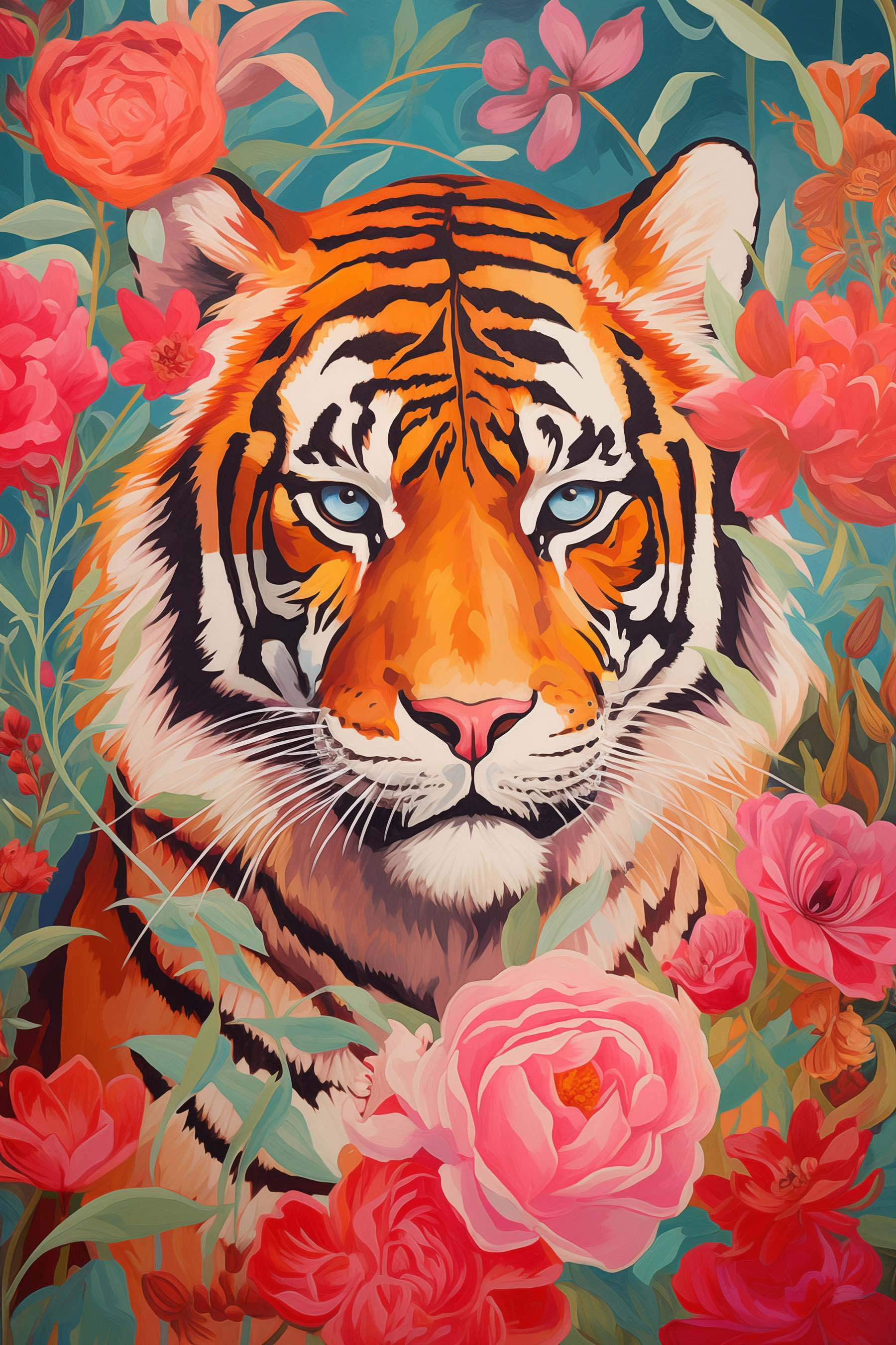 Pregătește-te să-ți transformi spațiul cu această uimitoare imprimare pe pânză, care înfățișează un tigru feroce înconjurat de flori vibrante. Este ca și cum ai avea o bucată din sălbăticie chiar în sufrageria ta. Culorile îndrăznețe ies în evidență ca cocktailul tău preferat de vară, făcându-te să nu-ți poți lua ochii de la ele. Imaginați-vă că vă cuibăriți cu o carte și ridicați privirea pentru a vedea această creatură maiestuoasă care veghează – ce subiect de conversație! Fie că decorează un colț confortabil sau adaugă un plus de stil unui perete galerie, această imprimare surprinde combinația perfectă între forță și frumusețe. În plus, de fiecare dată când treceți pe lângă ea, vă veți simți puțin mai aventuros. Cine nu și-ar dori asta?