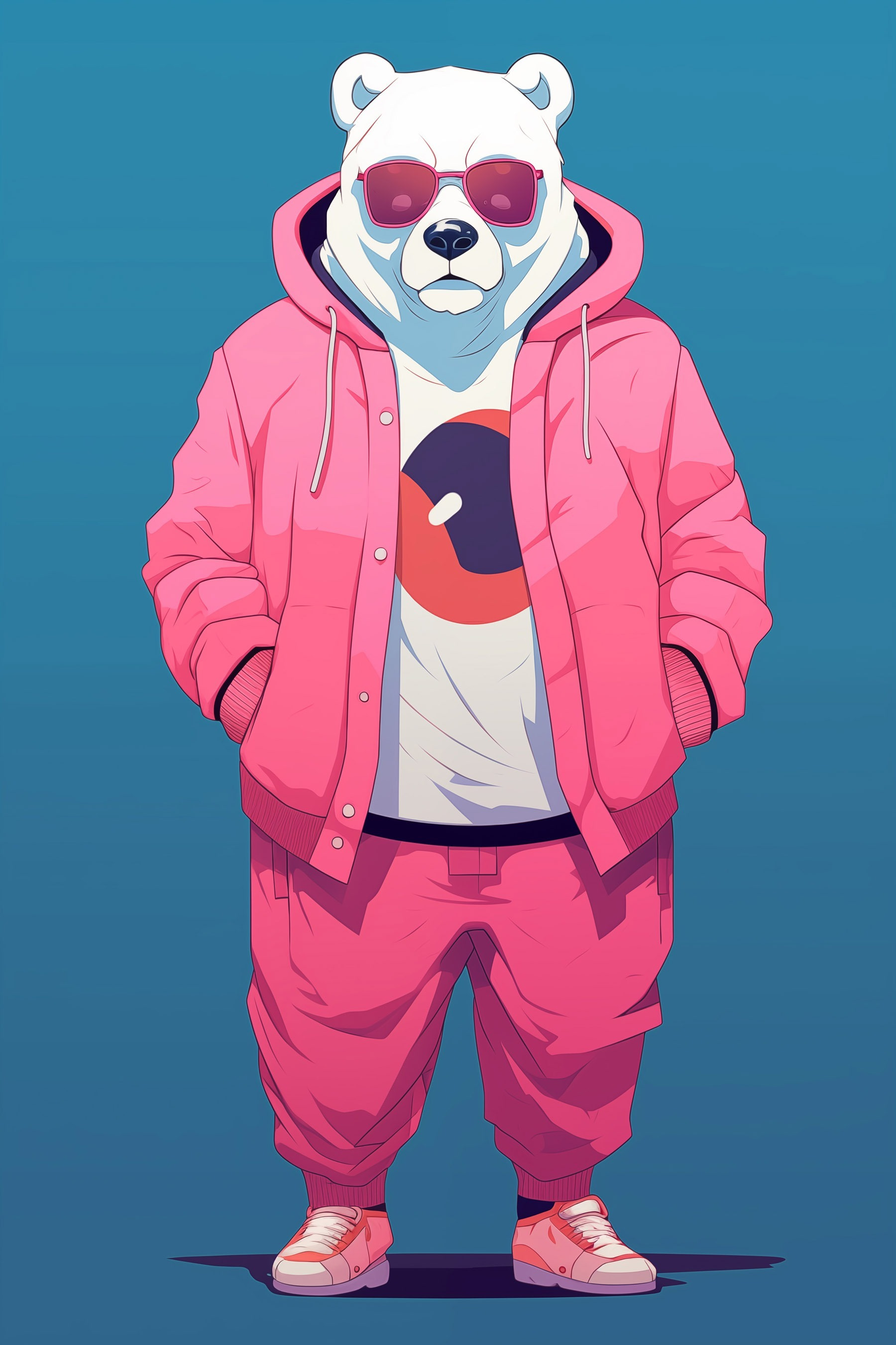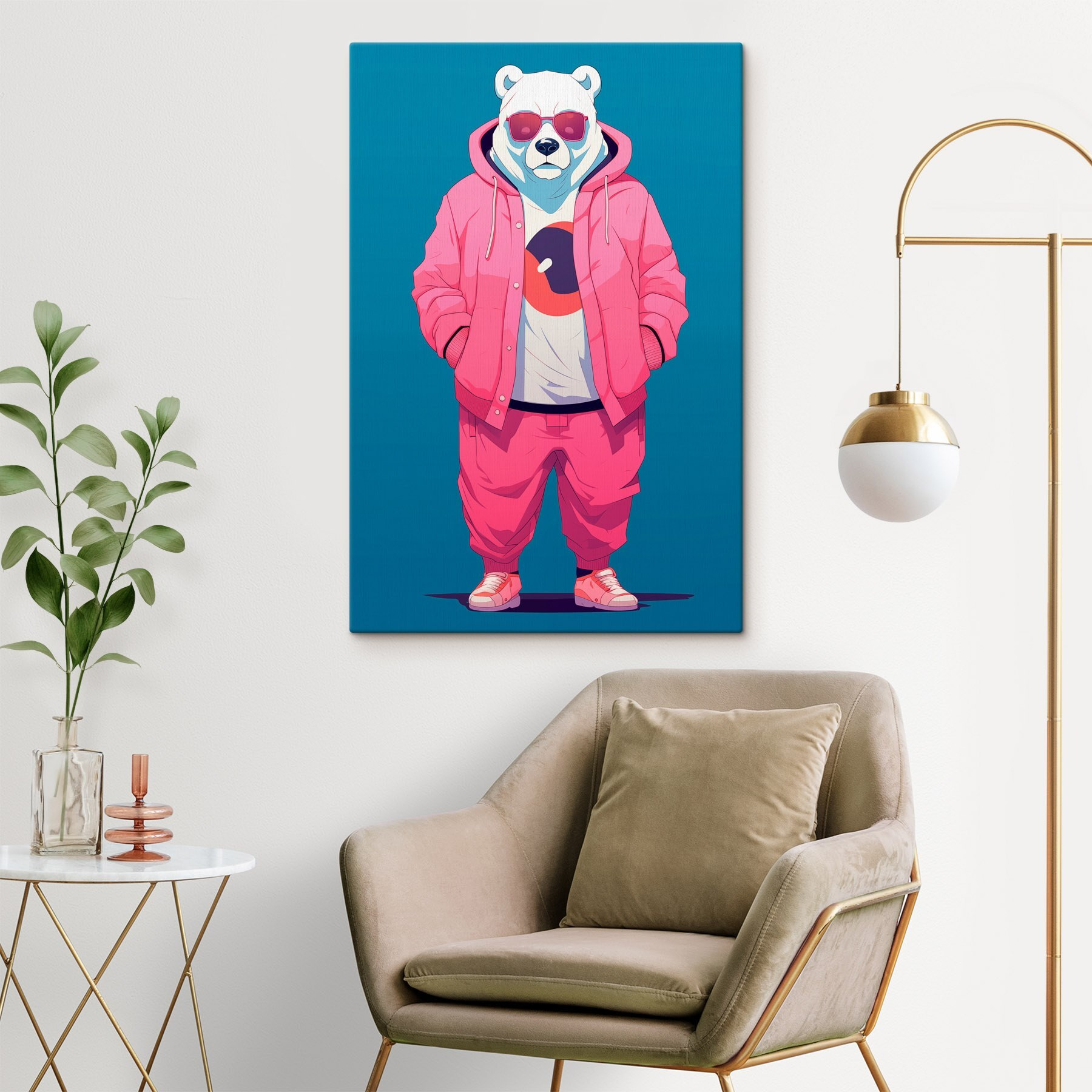 Aduceți un strop de personalitate în spațiul dvs. cu această imprimare funky pe pânză, care înfățișează un urs care arată absolut fabulos într-un hanorac și o jachetă roz. Nu în fiecare zi vezi un urs polar care își exprimă stilul urban interior! Imaginează-ți această piesă jucăușă atârnată în sufrageria ta sau într-un colț confortabil; cu siguranță va stârni câteva zâmbete sau conversații amuzante. Fie că îți plac lucrările de artă unice sau pur și simplu iubești animalele îmbrăcate fabulos, această imprimare adaugă o notă capricioasă care face ca spațiul să pară viu. În plus, cine nu și-ar dori un urs cu ochelari de soare care să vegheze asupra camerei? Este combinația perfectă între farmec și vibrații cool!