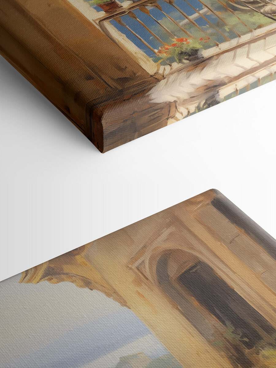 Imaginați-vă că pășiți pe un balcon confortabil, cu flori care dansează ușor în briză, cu vedere la apele senine, în timp ce soarele pictează totul în nuanțe calde. Această imprimare pe pânză surprinde perfect această evadare de vis. Aproape că puteți simți îmbrățișarea calmă a mării și auzi bătaia moale a valurilor. Imaginați-vă sorbindu-vă băutura preferată, pierduți în gânduri, în timp ce conversațiile suave plutesc în aer. Este ca o invitație de a încetini, de a respira adânc și de a absorbi momentul. Perfectă pentru orice cameră, această piesă aduce o felie de liniște și bucurie, făcând din fiecare privire o mini-vacanță.