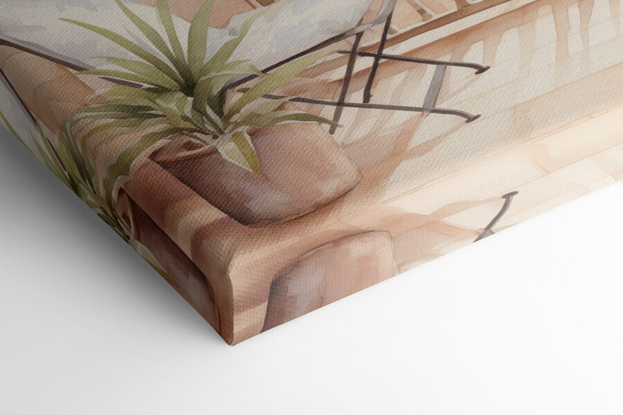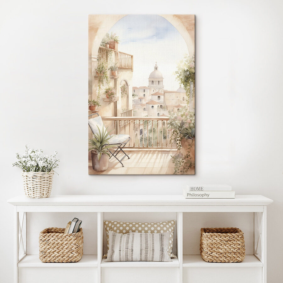 Imaginați-vă că pășiți pe un balcon fermecător, unde orașul se întinde sub un soare cald. Această imprimare în acuarelă surprinde perfect acel moment încântător. Cu tușe delicate de pensulă care îmbină pastelurile moi, imaginea invită la visare cu ochii deschiși la o ceașcă de cafea sau de ceai. Plantele care se revarsă peste ghivece aduc o notă de veselie, ca și cum ar invita exteriorul înăuntru. Este ca și cum ai avea pe perete o bucățică dintr-o escapadă europeană pitorească, care stârnește bucurie și dorință de hoinăreală în același timp. Perfect pentru a înveseli orice cameră – cine nu vrea un memento zilnic pentru a se opri și a aprecia frumusețea?