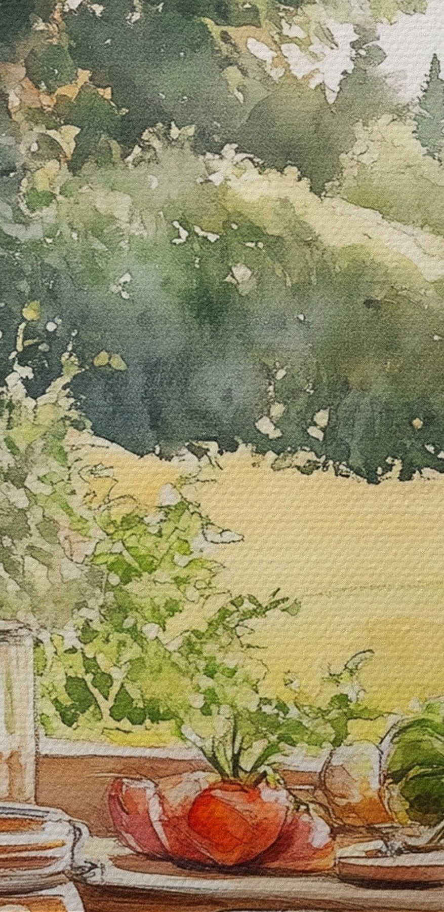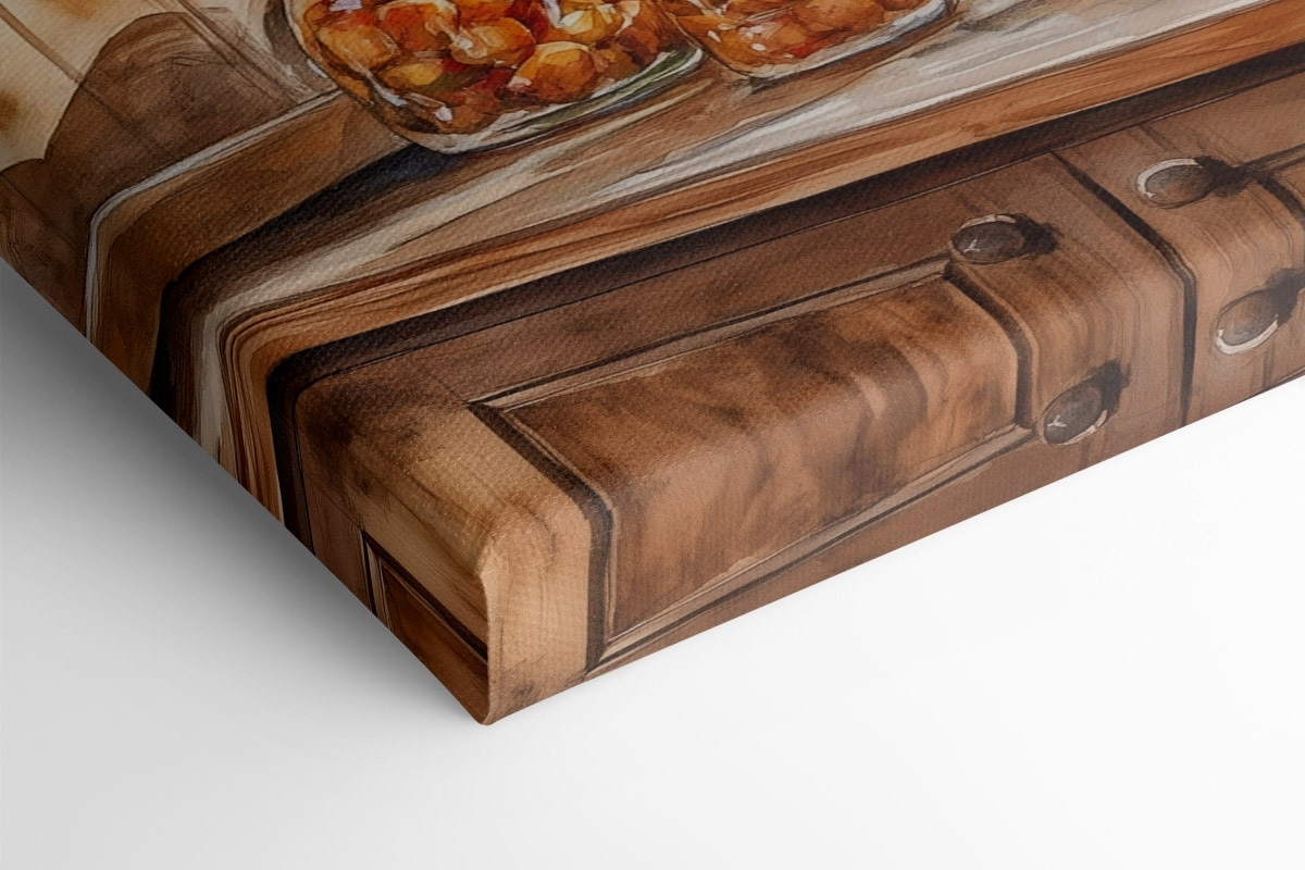 Aduceți o felie din viața confortabilă a bucătăriei în orice cameră cu această imprimare pe pânză de acuarelă. Imaginați-vă borcane pline cu bunătăți conservate vibrante, așezate confortabil pe pervazul unei ferestre însorite, așteptând doar să vă ducă într-o dimineață senină de la țară. Culorile blânde și tușele blânde ale pensulei îi conferă o căldură primitoare, precum mirosul de plăcintă cu mere proaspete care se simte în aer. Este perfectă pentru iubitorii de mâncare sau pentru pasionații de natură, stârnind visuri cu ochii deschiși despre rețete de casă sau după-amiezi liniștite petrecute culegând produse proaspete. Această piesă unește fără efort orice spațiu, adăugând un strop de farmec fără a transpira.