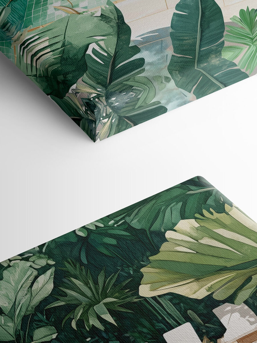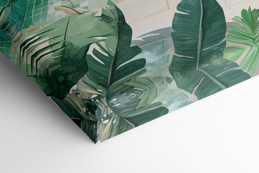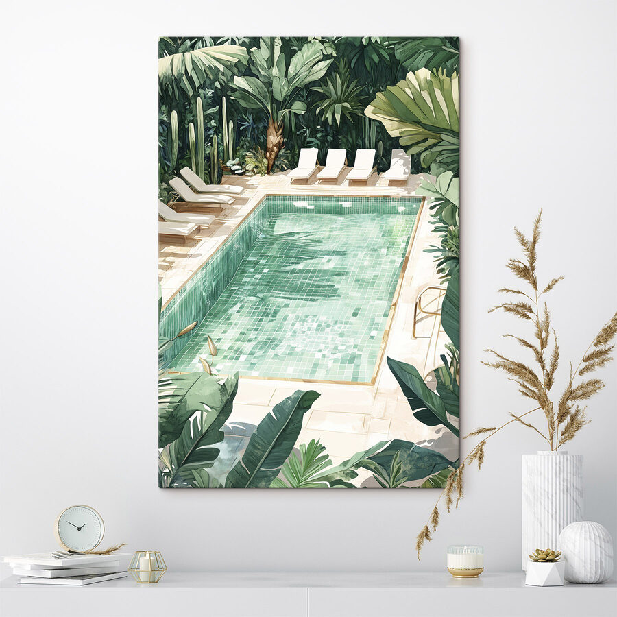 Intrați într-o mică felie de paradis cu această imprimare pe pânză atrăgătoare care prezintă o piscină fermecătoare înconjurată de verdeață luxuriantă. Imaginează-ți cum te relaxezi în aceste fotolii confortabile, cu un cocktail în mână, în timp ce soarele strălucește printre frunze. Culorile senine evocă un sentiment de calm și răcorire, fiind greu să nu visezi cu ochii deschiși la zile calde și după-amieze leneșe. Este piesa perfectă pentru orice cameră care ar avea nevoie de o atingere de fericire a naturii. Agățați-o și lăsați vibrațiile bune să circule – cine are nevoie de o vacanță când această frumusețe adaugă un strop de liniște spațiului dvs.?