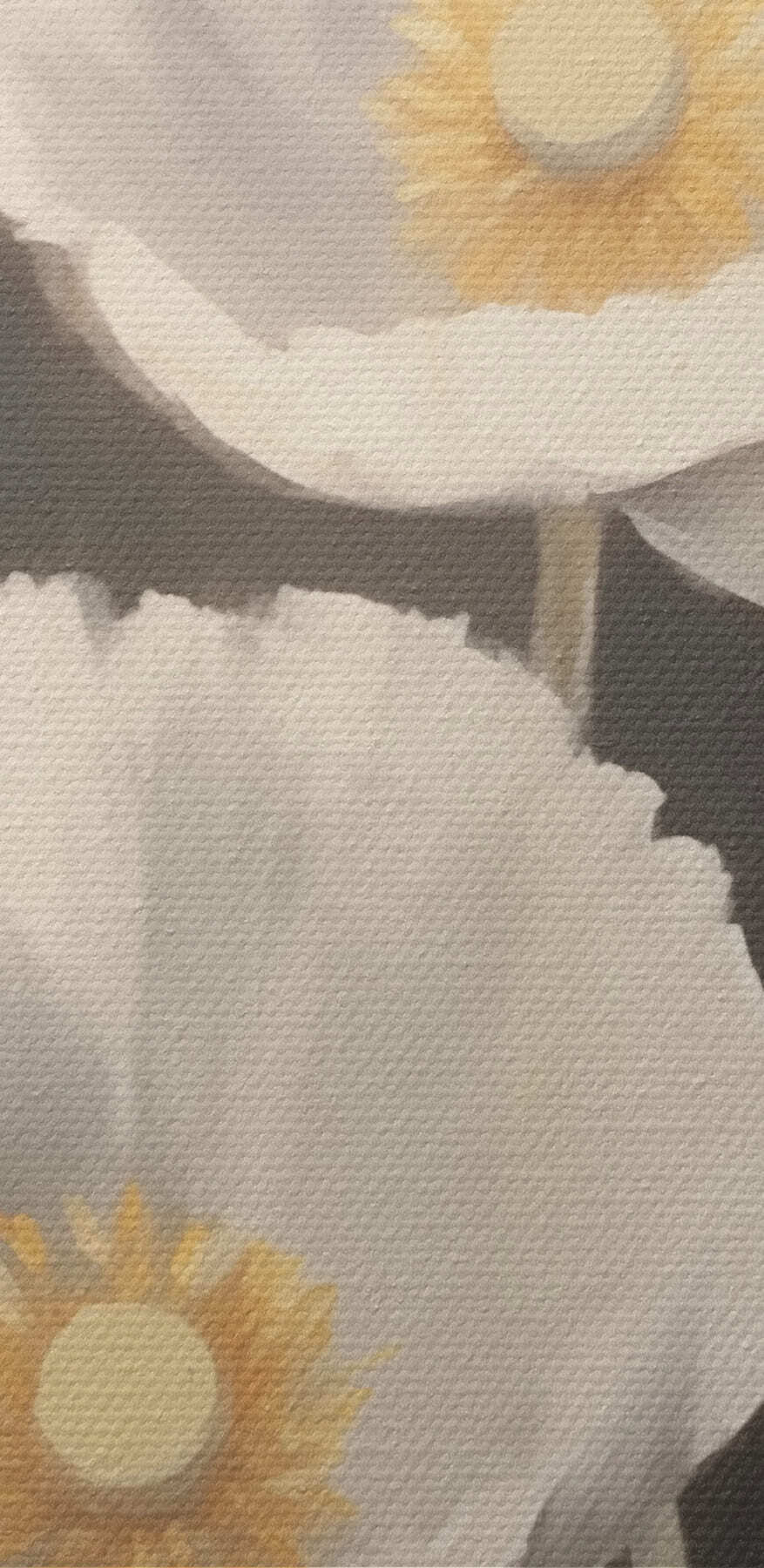 Transformați-vă spațiul într-un refugiu liniștit cu această imprimare uimitoare pe pânză care prezintă un grup fermecător de flori albe. Florile moi și delicate creează un contrast blând pe un fundal liniștitor, invitând seninătatea în orice cameră. Imaginați-vă sorbind cafeaua în timp ce priviți această frumusețe sau folosind-o ca sursă perfectă de conversație atunci când prietenii trec pe aici. Este ca și cum ai avea o bucățică de natură în interior, fără insectele deranjante. Această operă de artă nu este doar atârnată pe perete; ea dă viață casei tale. Perfectă pentru iubitorii de flori și pentru oricine urmărește o atmosferă confortabilă!