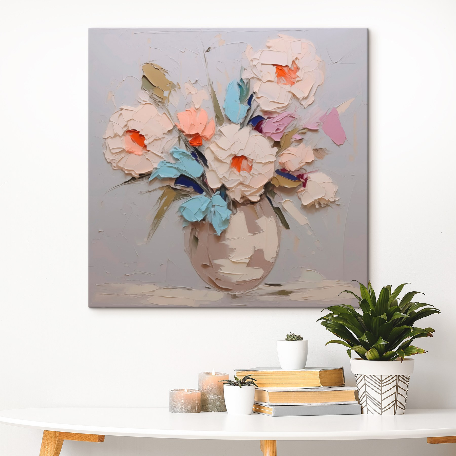 Transformați-vă spațiul cu acest print pe pânză care prezintă un buchet încântător de flori într-o vază. Este ca și cum ai aduce un pic de primăvară în casa ta, indiferent de anotimp. Imaginați-vă că vă sorbiți cafeaua de dimineață în timp ce aceste culori vibrante vă înveselesc ziua. Pastelurile moi sunt un deliciu pentru ochii supărați, iar acea explozie jucăușă de portocaliu? Bucurie pură. Perfectă pentru o cameră de zi confortabilă sau un colț vesel, ar putea stârni o conversație sau două. În plus, cui nu-i place un pic de farmec floral pentru a înveseli atmosfera? Totul ține de acele mici momente, nu-i așa?